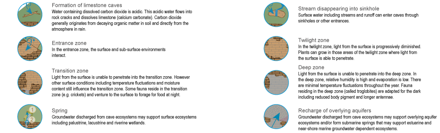 Click on elements of the model or select from the tabs below Subterranean wetlands include all underground areas containing water, including caves and aquifers. Subterranean cave systems are groundwater dependent ecosystems. Subterranean cave systems with large void sizes are part of ‘karst landscapes’ often characterised by sinkholes and springs. Karst landscapes are commonly found in regions where carbonate rocks are abundant. Carbonate rock may be fractured and/or dissolved by mechanical weathering and chemical weathering from contract with water (e.g. rain and soil water naturally containing weak acids). Subterranean cave ecosystems can be divided into four zones (shown as focal circles in the conceptual model):