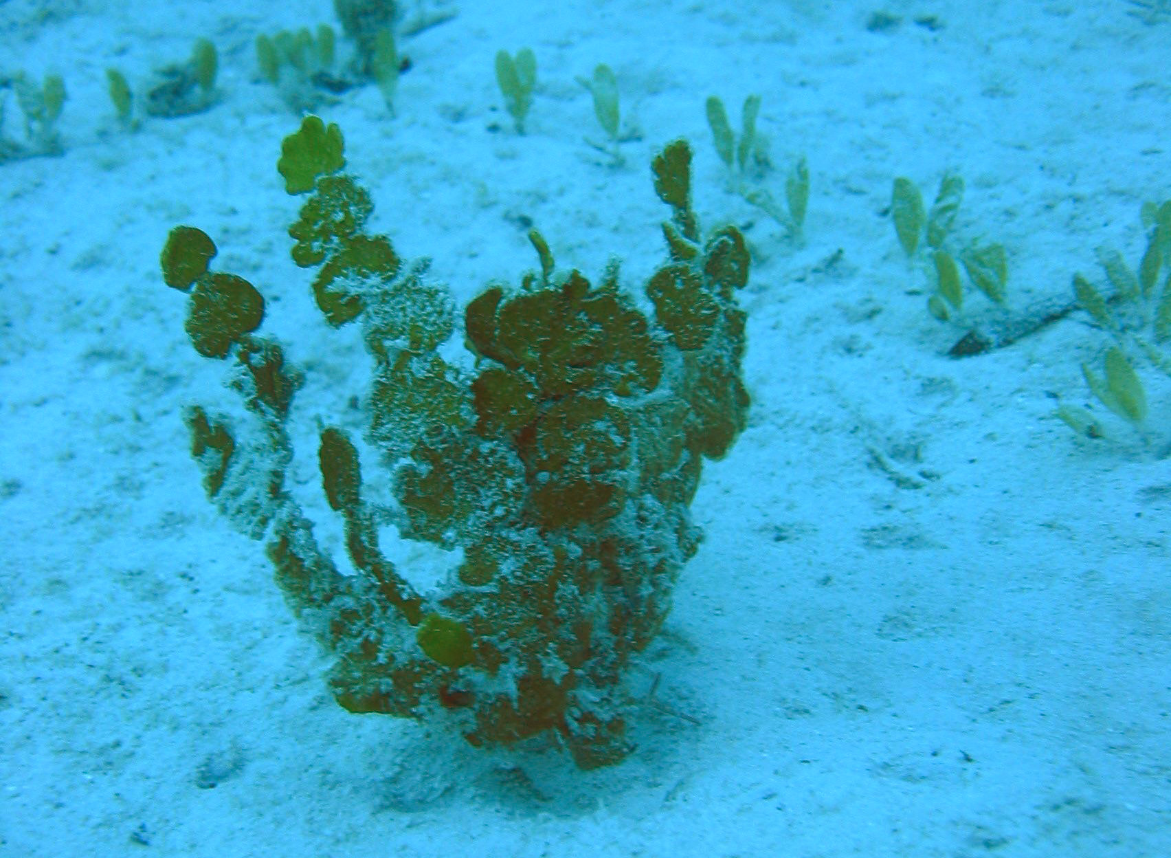 Classification categoriesSelect from the links below to view related ecosystem type categories Long descriptionSubtidal erect calcareous macroalgae (i.e. those with an erect growth form and containing calcified segments[2]), including the genera Halimeda, the green Udotea and the red Amphiroa. Erect calcareous algae occurs on coral reefs on the reef flat and in the lagoon, and in shallow and deep nearshore areas, on unconsolidated substrates. Macroalgae are marine plants that photosynthesise in all cells, and have a simple holdfast to anchor onto substrates such as rocks, shells or gravel. Halimeda spp. has developed special anchoring filaments (rhizoids), which bind sediment and sand into a lump that enables them to anchor onto unconsolidated substrates. Rather than having leaves like seagrasses, erect calcareous macroalgae have a blade-like growth form which is divided into segments. The calcified segments can form branching growths that form thickets which create benthic structure[1].