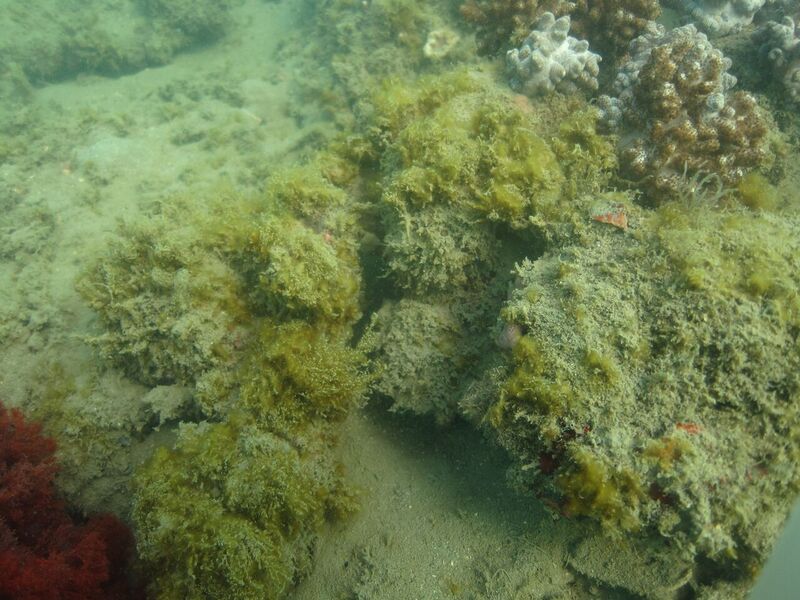 Classification categoriesSelect from the links below to view related ecosystem type categories Long descriptionSubtidal turf algae growing as a dense mat or ‘turf’ on either consolidated or unconsolidated substrate[4]. Algal turfs are usually less than 10 millimetres in height, and can be assemblages of many species of minute algae, often in association with unconsolidated substrates such as muds and sands. Algal turfs often persist because constant grazing by herbivores prevents overgrowth by macrophytic algae. Common species on inshore reefs are from the genera Lyngbya, Acetabularia, Cladophora and Sphacelaria, with a different suite of species dominating offshore reefs[2]. Algal turfs are common in the shallow subtidal area close to the shoreline and less than 5 metres below the sea surface. They are often in a band above that occupied by zoanthids and ascidians, soft corals (i.e. octocorallians*) and hard corals (in bands of descending depth). Associated fauna include low density zoanthids and ascidians as well as soft corals (e.g. octocorallians from the genera Cladiella, Klyxum)[5]. Turf algal ecosystems may also occur on unconsolidated substrate where they may be a minor component of seagrass ecosystems. Usually found in low energy environments, although they may occur as a minor component on the lee of high energy rocky shores where areas are subject to sand scour. Herbivorous biota play a significant role in encouraging or discouraging algal growth on coral reefs, depending on the intensity of grazing and preferred food. Farming damselfish defend their territories from other foraging fish, halting the algal succession at the turf algae stage on a coral reef substrate[1]. *Octocorallia is a subclass of the class Anthozoa in the phylum Cnidaria, and include soft corals, gorgonians, sea whips, sea pens, sea fans and octocorals. Like some of the many other anthozoans, octocorallians are sessile polyp-bearing animals with a mobile larval phase. Octocorallians are distinguished by the eight (i.e. octo) tentacles in each polyp. Most octocorallians do not deposit a rigid calcium carbonate exoskeleton, and therefore tend to attach to reefs rather than contribute to reefal frameworks as per the reef building Scleractinian (hard) corals[3]. Special valuesAlgal turfs often coexist with coral communities. Diagnostic attributesInundation 'Subtidal' Structural macrobiota 'Algae - turf' QualifiersAlthough unmapped, Period and Trend qualifiers are relevant as turf algae is variable in extent over time. DistributionTurf algae ecosystems are found throughout Queensland waters. The following relates to distribution of this ecosystem type within the Central Queensland mapping area: