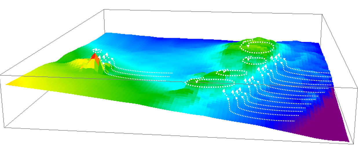 Terrain relative reliefTerrain relief is the difference in elevation between the high and low points of a land surface[8], that is, the change in the height of the ground over the area[10]. Terrain relative relief (or elevation) is the relative difference in elevation between a morphological feature and those features surrounding it (e.g. height difference between a peak and surrounding peaks, a depression and surrounding depressions etc.). Together with terrain morphology, and other terrain attributes, it is useful for describing how the terrain affects intertidal and subtidal processes. Quick facts