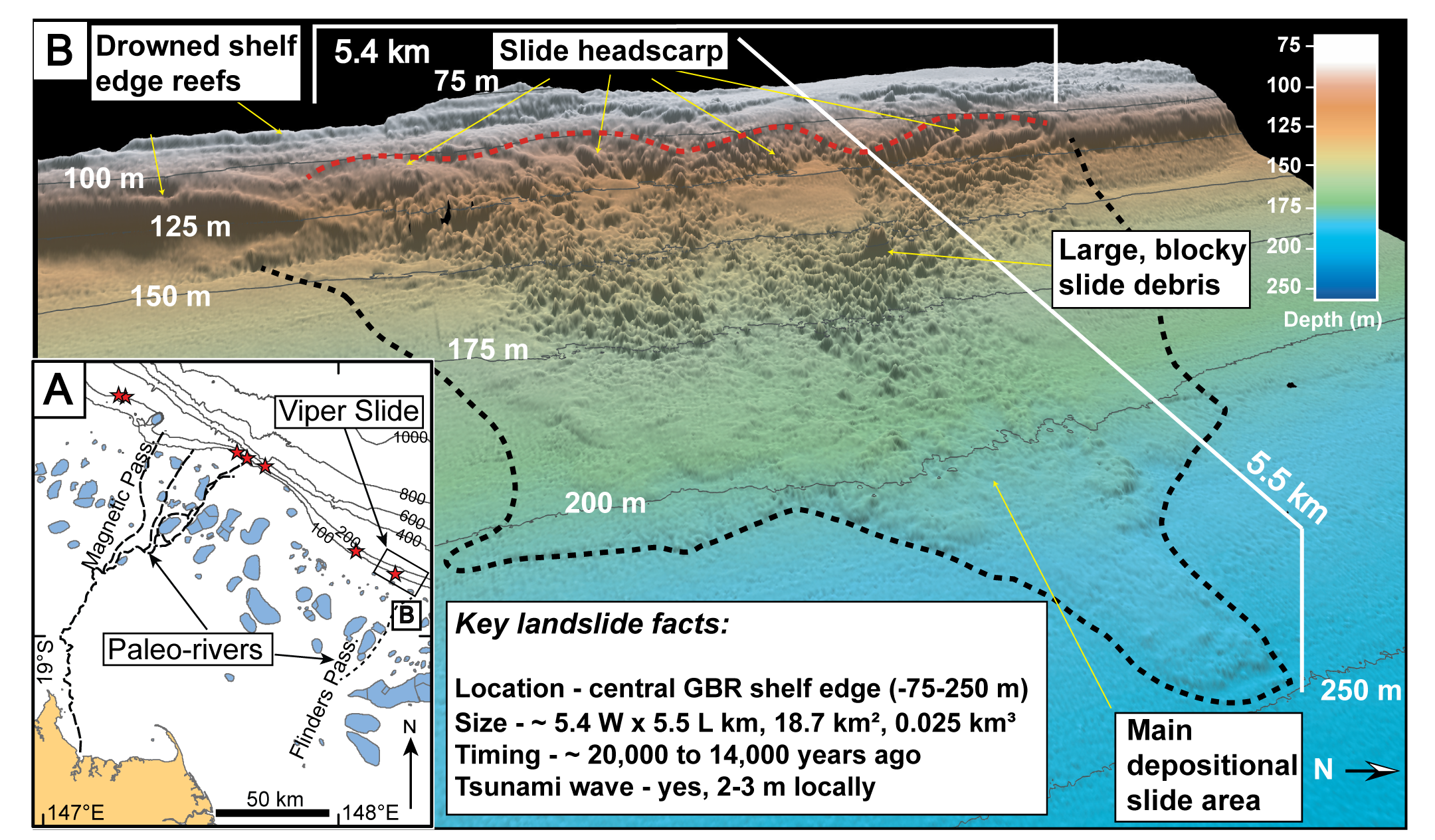 Terrain slopeWhy is terrain slope important?Slope is frequently used in combination with other terrain attributes such as benthic depth, roughness, and morphology to classify and allocate types to morphological features of the sea floor and their structural macrobiota[11]. The term slope can be applied to describe a morphological feature, e.g. the ‘shelf break’ is a very steep slope at the edge of the continental shelf, and beyond it the ‘continental slope’ marks a less steeply inclined area between the shelf break and abyssal plain (gently inclined or flat). On land and intertidally, under the force of gravity, water moves from higher to lower elevation, transporting sediment and dissolved material. Its rate of movement is determined by a number of factors including the terrain slope, as the water will flow faster the steeper the slope, and the roughness of the terrain[5]. The speed and rate at which water moves through the terrain has implications for erosion, deposition, drainage and runoff, infiltration, and a range of other hydrological processes[18]. Sediment is transported by gravity, wind, wave, tidal and other current action and slope influences the rate at which this happens. On land, the rate of soil loss is proportionate to the steepness and length of a slope[23][26]. Steep terrain slopes are commonly encountered in subtidal areas, as the effects of gravity are lessened by the buoyancy of water counteracting the gravitational force (Archimedes’ Principle). The energy of the water interacts with the terrain, driving geomorphological and hydrological processes[24]. Riverine, wave and tidal currents are capable of modifying terrain slopes and displacing sediment to form cliffs, channels, caverns and dunes[25]. In the intertidal area, the steepness of the beach face is an important attribute in coastal morphodynamic research, being related to hydrodynamic energy, grain size, and tidal range[20]. When manually delineating morphological features it is often easier to distinguish the features based on the rate of change of the slope e.g. the slope of the slope. For example rapid changes in slope mark the tops and sides of ridges, edges of channels and pits (terrain morphology). Changes in slope at different scales inform the characterisation of morphological features, benthic habitat types and geomorphological processes, from the habitat scale (e.g. coffee rock ledges) to the regional scale (e.g. the shelf break). Rapid changes of slope may originate from differences in substrate (e.g. consolidated substrates such as reefs), energy sources and magnitudes (e.g. wave-cut platforms, riverine eroded channels), and/or indicate different sea level histories and associated geomorphological processes of erosion and deposition. ‘Reef slope’ is the steepest part of the seaward section of a coral reef[8]. On a coral reef, the shallow reef slope is frequently the standard location for surveying representative areas of coral cover as an indicator of active coral reef building (e.g. Van Woesik and Done[19]). The elevation of coral reefs can be a marker of the current and previous position of sea levels over the last 20,000 years. Some reefs drowned, while others kept pace with sea level rise[22][8]. Very steep slopes of unconsolidated substrates may result in undersea landslides, forming similar morphological structures seen on land (e.g. fans) and even result in tsunamis capable of having far reaching effects on shorelines. Submarine landslides that occur on slopes are capable of transporting vast amounts of sediment from the continental shelf to the deep sea floor, even changing continental margins[21].