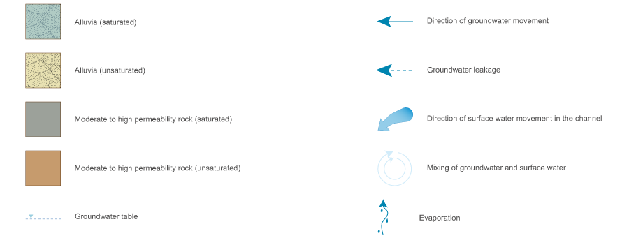 Click on elements of the model or select from the tabs below Alluvial aquifers with dams with limited or no sustained surface water dischargeAlluvial aquifers are formed from particles such as gravel, sand, silt and/or clay deposited by fluvial processes in river channels or on floodplains. These deposits store and transmit water to varying degrees through inter-granular voids. These aquifers may have structures, such as dams, that modify the flow of surface water and groundwater. Where dams restrict the discharge of surface water, there is less recharge of downstream alluvial aquifers from channels reducing their saturation over time. This can also occur in dry or drought conditions. Both stream and alluvial aquifers may then be recharged from other adjacent aquifers (e.g. permeable rock aquifers).