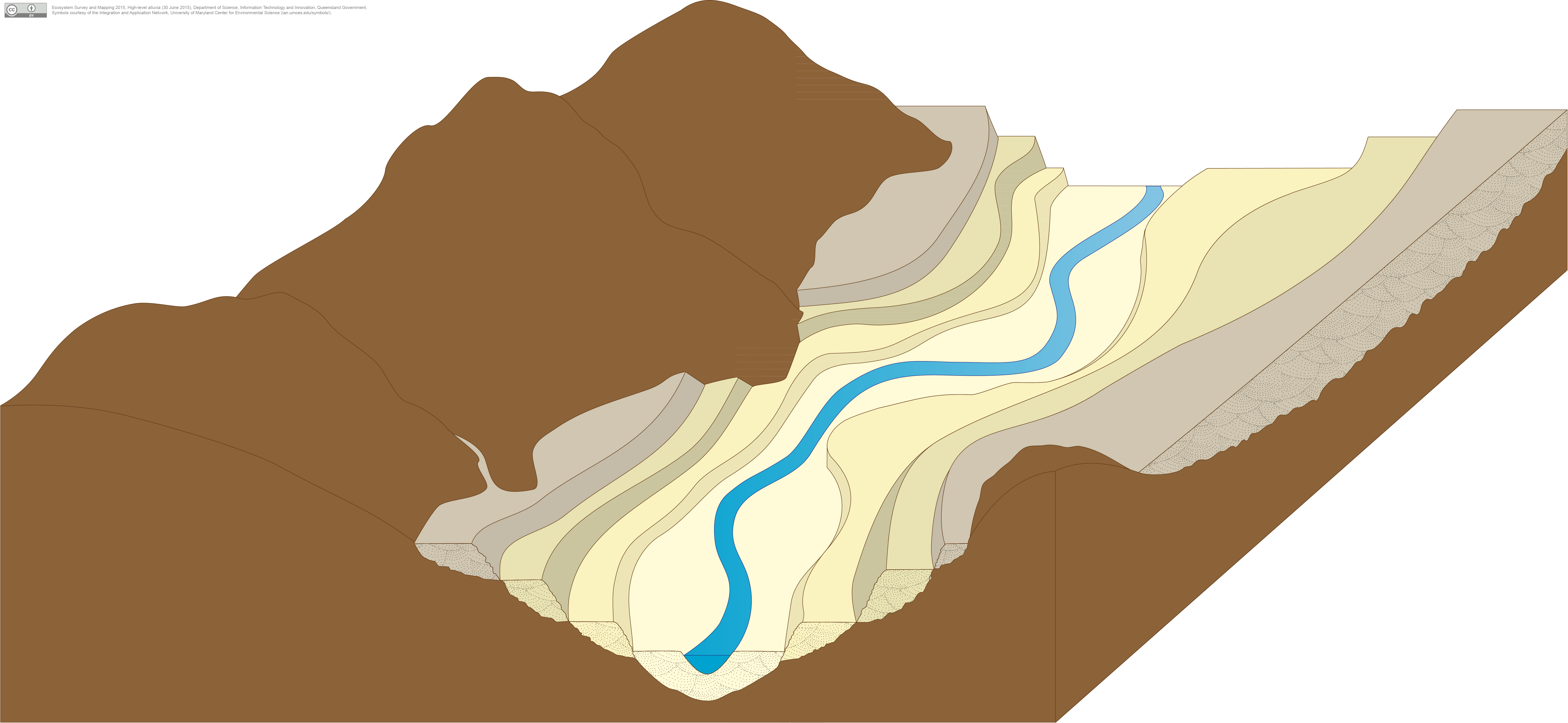 Click on elements of the model or select from the tabs below The term 'high-level' alluvia refer to alluvia deposited in ancestral valleys which are located above the channels in the current landscape in a form of inverted relief. Over time a channel will erode through older alluvial deposits resulting in older alluvia appearing in the banks above the channel. This model shows the process of terrace development and does not show groundwater. Pictorial conceptual model PDF Additional links Last updated: 18 December 2015 This page should be cited as: Queensland Government, Queensland (2015) High-level alluvia, WetlandInfo website, accessed 15 December 2025. Available at: https://wetlandinfo.detsi.qld.gov.au/wetlands/ecology/aquatic-ecosystems-natural/groundwater-dependent/alluvia-high-level-bedrock/ |