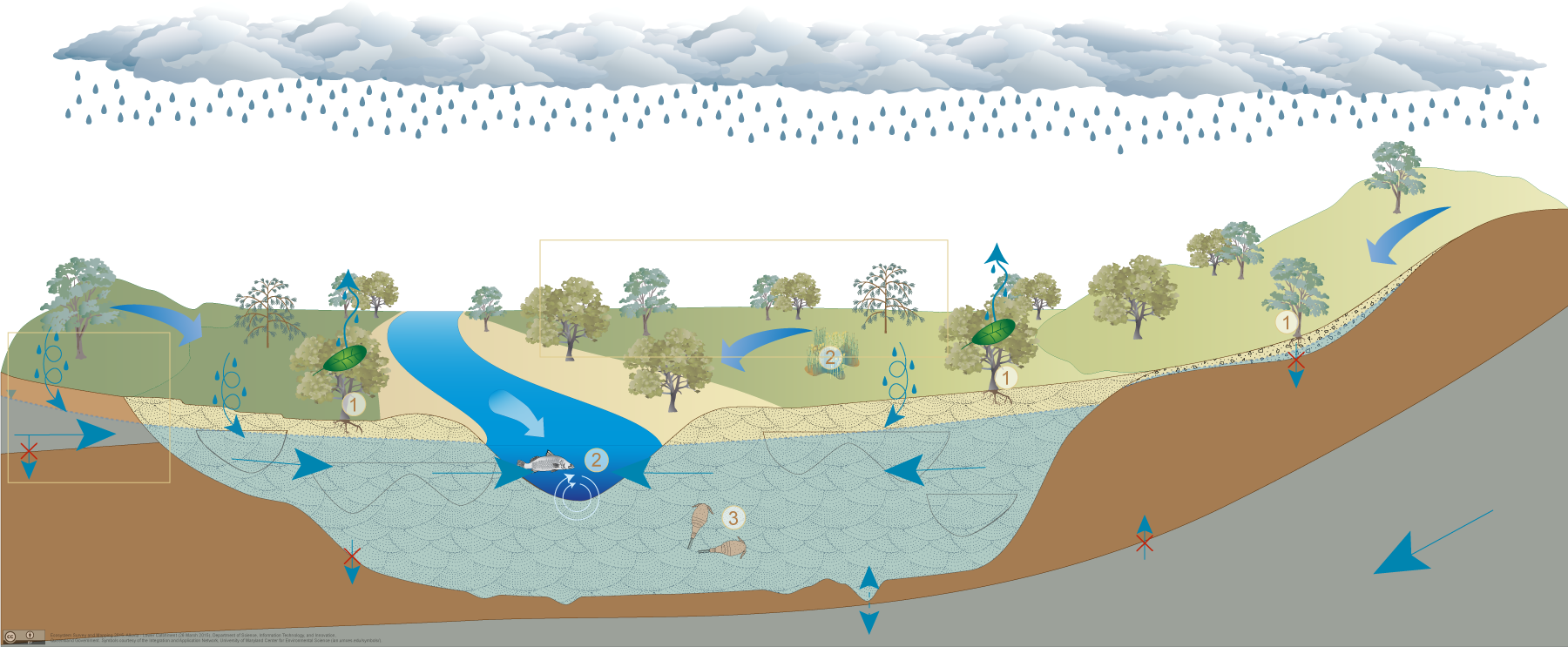 Click on elements of the model or select from the tabs below Alluvial aquifers are formed from particles such as sand, silt and/or clay deposited by physical processes in river channels or on floodplains. Alluvia can contain one or more unconfined, unconsolidated sedimentary aquifers, where groundwater is stored and transmitted through intergranular voids between gravel and sand particles. These unconsolidated sedimentary aquifers may be layered and/or discontinuous due to the presence of deposits of low permeability silt and clay within the alluvia. Alluvia in lower catchment areas tend to be significantly wider and deeper than alluvia further up-catchment. Alluvia may also contain a number of paleo-channels, remnants of old channels and riverbeds. Paleo-channels may transmit groundwater faster than the surrounding alluvia and may also form perched aquifers under certain conditions. Underlying the alluvia may be an impermeable rock layer which would act as a confining layer separating the unconfined sedimentary aquifer in the alluvia from other groundwater bearing geologies. Flood events provide significant recharge of alluvial aquifers (see Recharge conceptual model). Unconsolidated sedimentary aquifers in lower catchment alluvial deposits may provide a range of ecosystems with water required to support their plant and animal communities, ecological processes and delivery of ecosystem services.