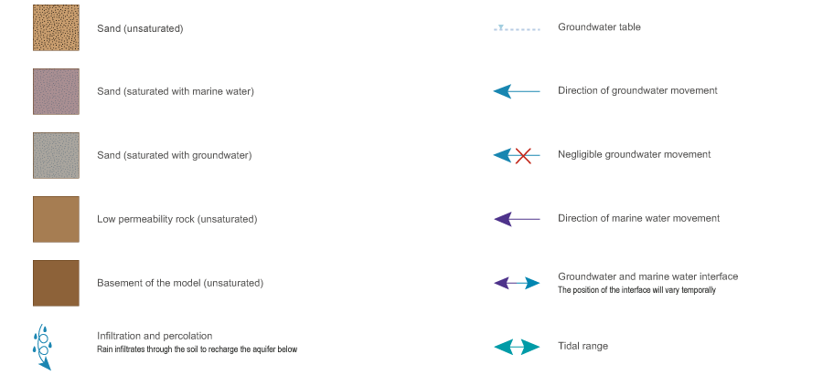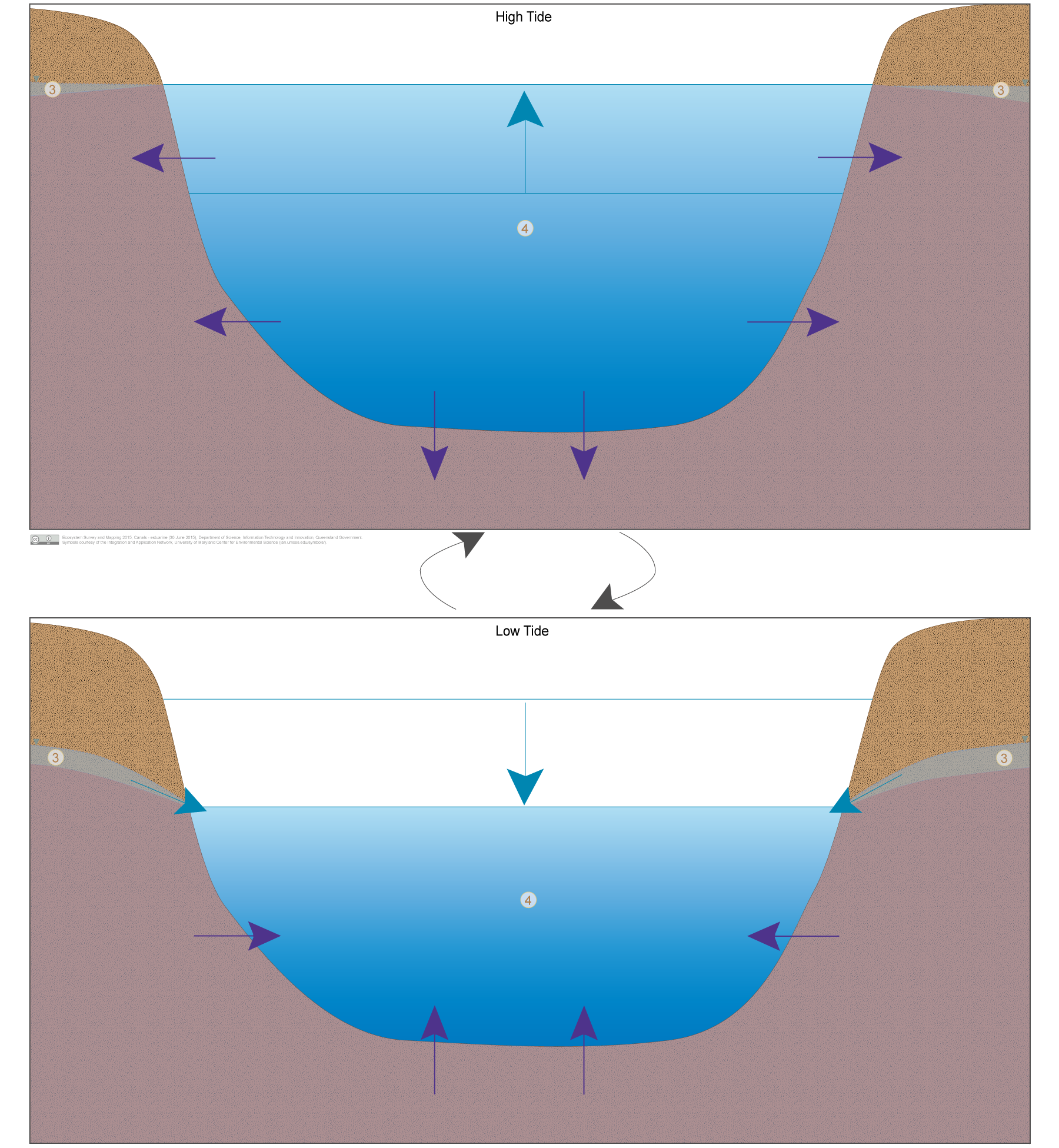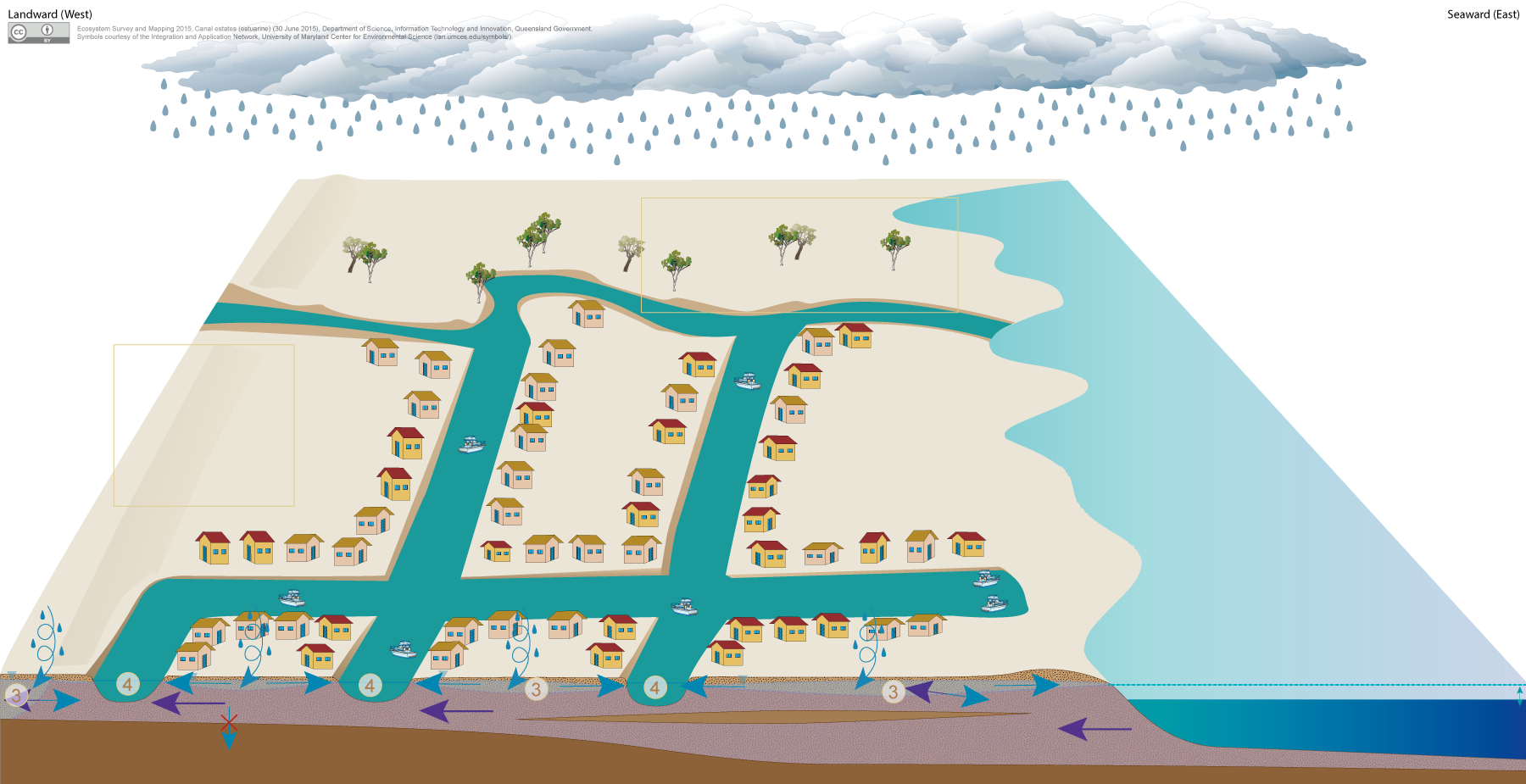 Canal estates (estuarine)Canal estates (estuarine)![]() ![]() Click on elements of the model or select from the tabs below Estuarine canal estates are man-made canals that are connected to estuaries and therefore have tidal influence. The canals are usually dug into unconsolidated sedimentary aquifers including coastal sand masses (see coastal sand masses – beach ridges) or alluvia deposited during periods of higher sea level by fluvial processes in current river channels, floodplains, estuaries, deltas and other near-shore environments (see low-lying coastal swamps). These unconsolidated sedimentary aquifers store and transmit groundwater through inter-granular voids between gravel and sand particles. At high tide marine water from canals infiltrates adjacent unconsolidated sedimentary aquifers. A thin lens of fresh groundwater is supported above the saline marine water which may then discharge back into the canal at low tide. These areas may support fauna and flora communities, ecological processes and delivery of ecosystem services.