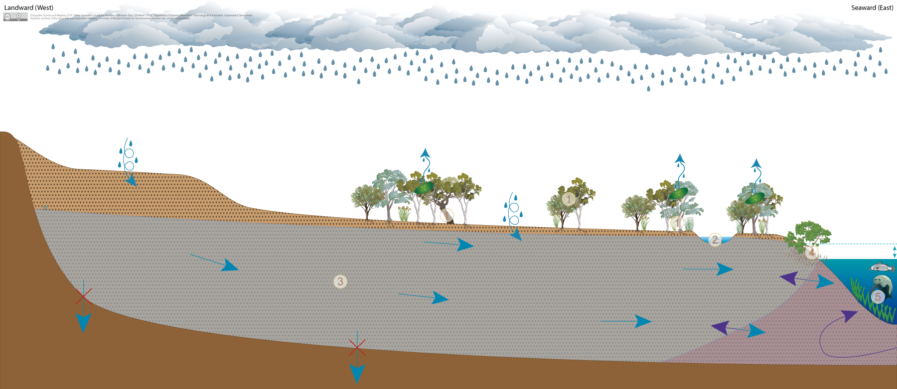 Click on elements of the model or select from the tabs below Weathered basalt of the Petrie Formation in coastal areas (Redland basalt) is moderately to highly permeable and may form aquifers which store and transmit groundwater through vesicles, fractures and weathered zones. Vertical groundwater movement from a basalt aquifer is often restricted by underlying unweathered bedrock which may have lower permeability. While groundwater will often continue to leak through the less permeable rock to some degree, typically groundwater moves laterally and can be discharged to the surface or offshore along the contact between weathered basalt and underlying less permeable rocks. Where deeply weathered Petrie basalt occurs along the shoreline of Moreton Bay it usually supports a shallow water table, and groundwater often discharges into near-shore marine environments of Moreton Bay. A range of ecosystems may depend on groundwater within these unconfined, basalt aquifers to support their plant and animal communities, ecological processes and delivery of ecosystem services: