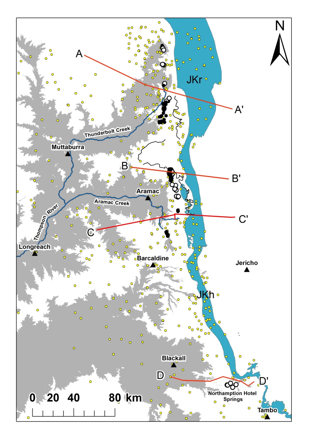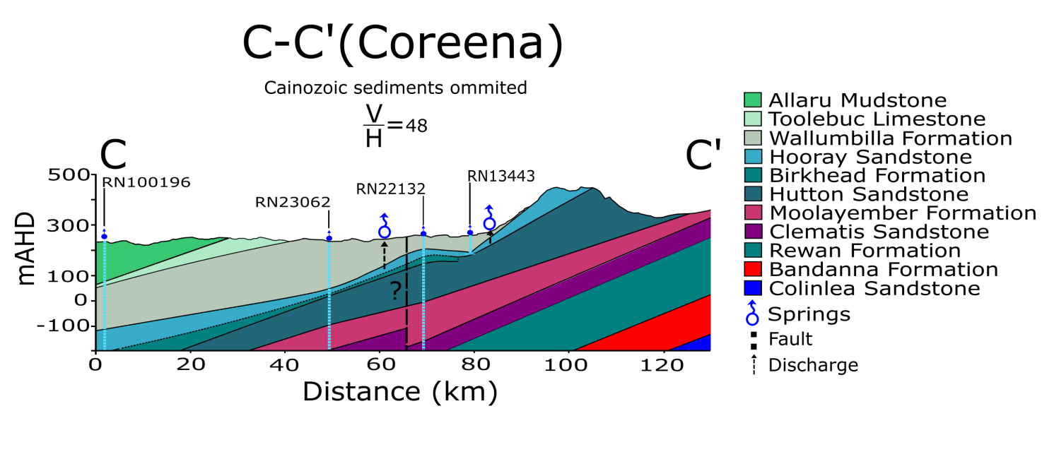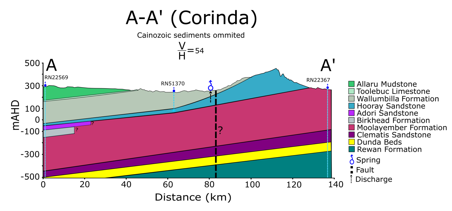 Stratigraphic sections bisecting this line of springs suggest that they occur where there is a coincidence of a relatively thin confining layer and artesian pressure. Further to the east of this line there is insufficient aquifer pressure to provide artesian flow, and west of this line the aquitard may be too thick for a flow path to form. Where the springs occur the Wallumbilla formation generally between 40 and 100m m deep, but it may be considerably reduced where current streams enhanced erosion. The Wallumbilla Formation may include permeable beds sufficient to transmit discharge from the underlying sandstone over such distances.