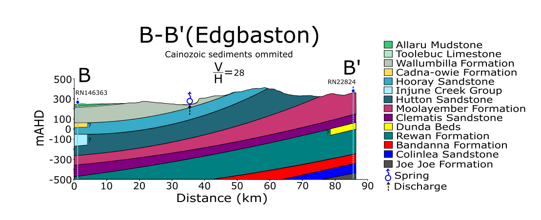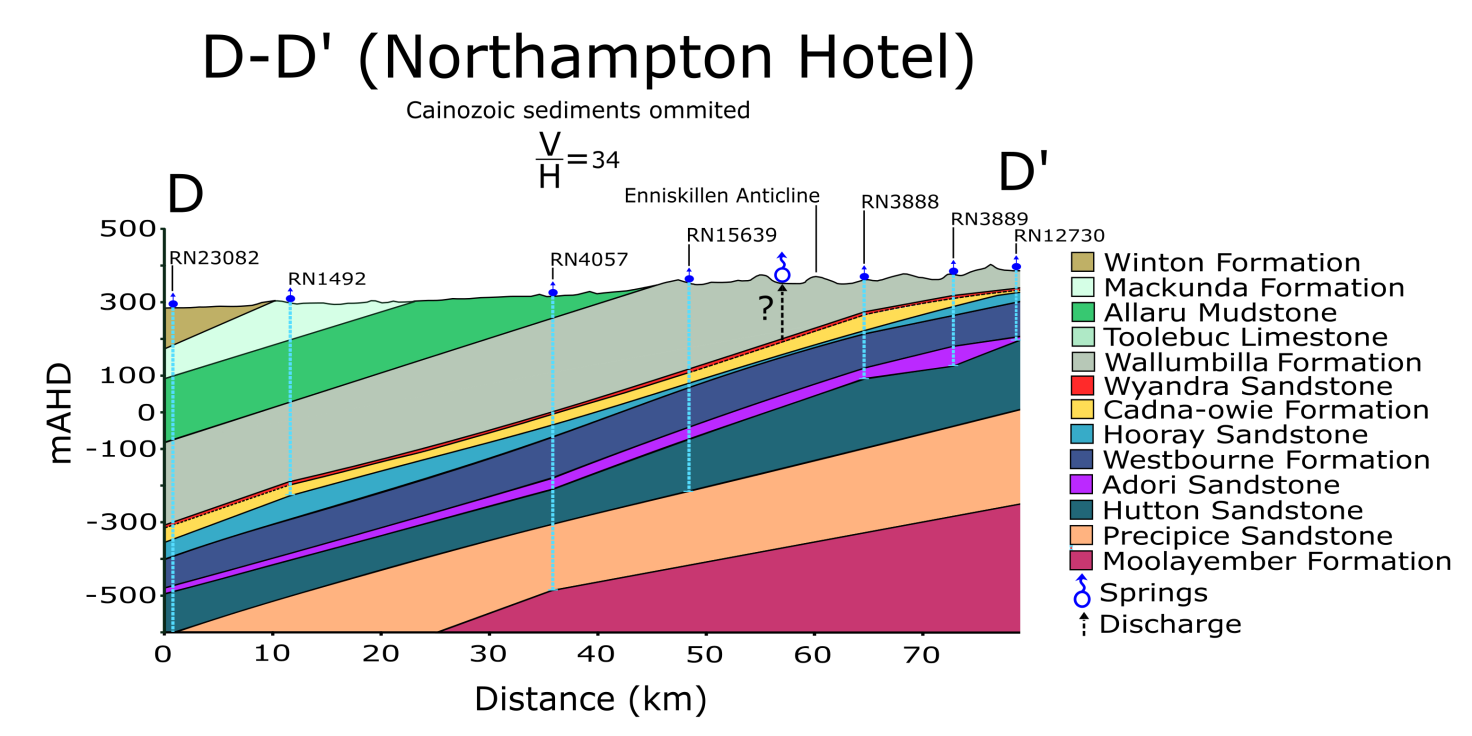 These springs (with the exception of the Northhampton Hotel Springs) almost certainly emanate from the Ronlow Beds/Hooray Sandstone where erosion has thinned or bisected the overlying Wallumbilla Formation. The springs occur along the margin of where the potentiometric surface in the Hooray Sandstone becomes artesian.