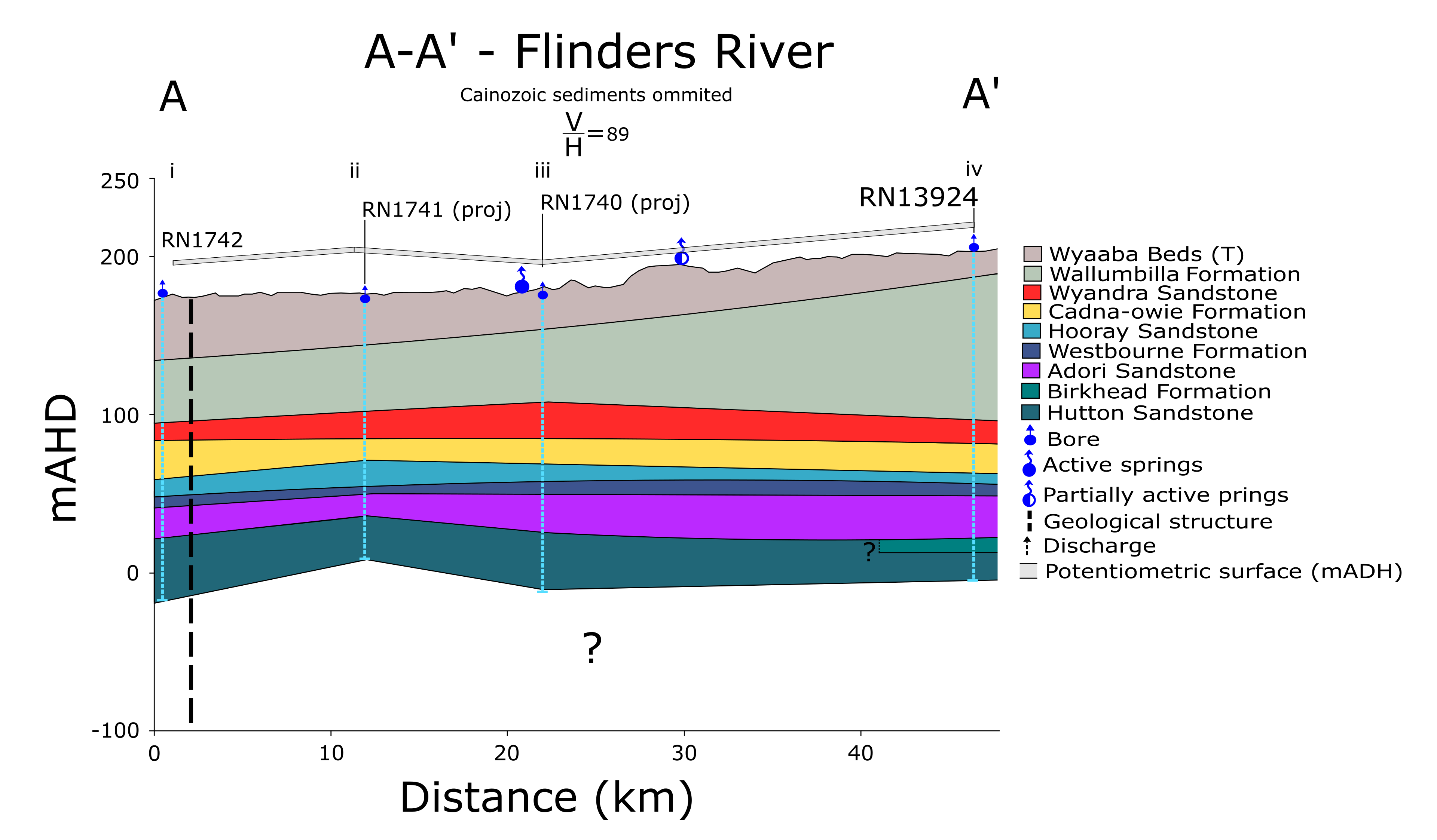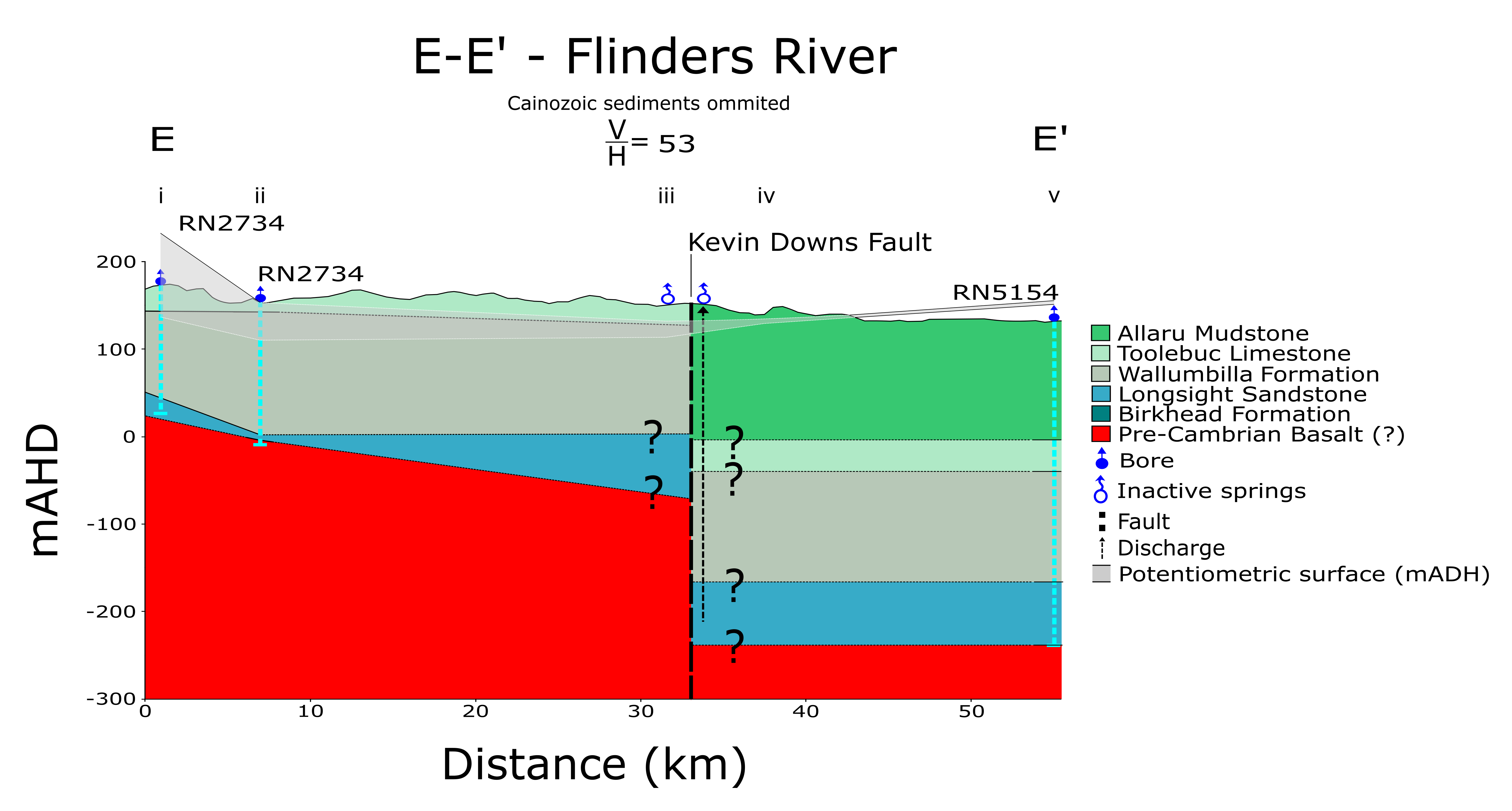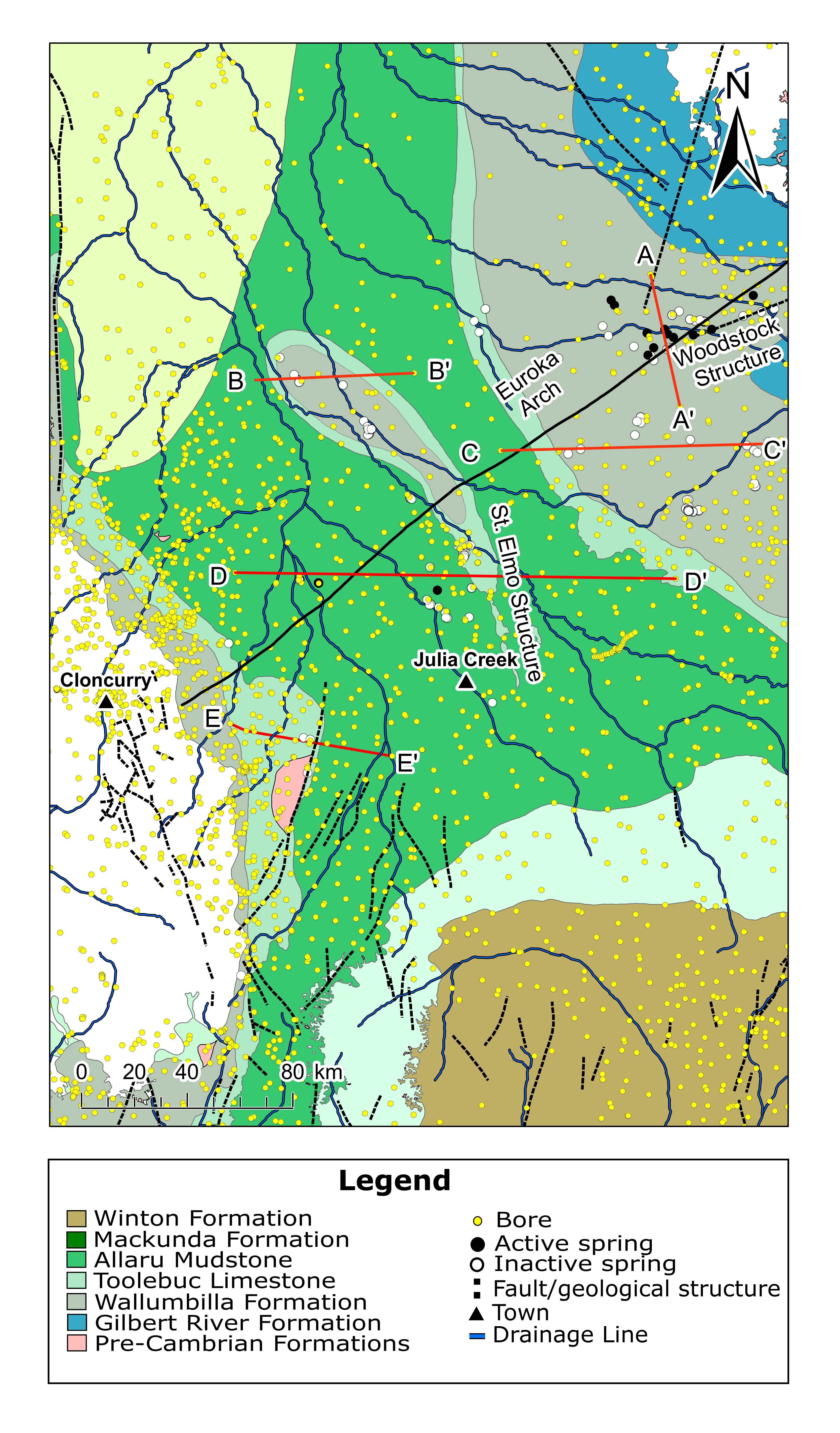 The Flinders River supergroup spans the Euroka Arch a basement structure partially separating the Carpentaria Basin from the Eromanga Basin. Granite provides the basement in the northern Eromanga Basin in the southwest of the supergroup and is exposed in a very limited area by the Kevin Downs Fault. The basement of the Carpentaria Basin in the vicinity of the springs are metamorphosed sediments and these Precambrian schists outcrop in the vicinity of springs at Mt Fort Bowen, Mt Brown and Mt Little. The Gilbert River Formation forms the lower unit of the Mesozoic sedimentary sequence and is the main water-bearing aquifer for the springs in this supergroup. Some stratigraphic sequences in bores describe Hooray Sandstone, Cadna-owie Formation and Wyandra Sandstone, but these units are synonymous with facies within the Gilbert River River. This sandstone is overlain by a sequence of Cretaceous units, the Wilgunyah Formation, the Toolebuc Member and the Allaru Member that act as aquitards. The Gilbert River Formation outcrops extensively in the eastern part of the Supergroup and there are many large outcrop springs, many of which are isolated in rugged ranges, providing baseflow for major streams including the Woolgar, Norman, Clara and Yappar Rivers.