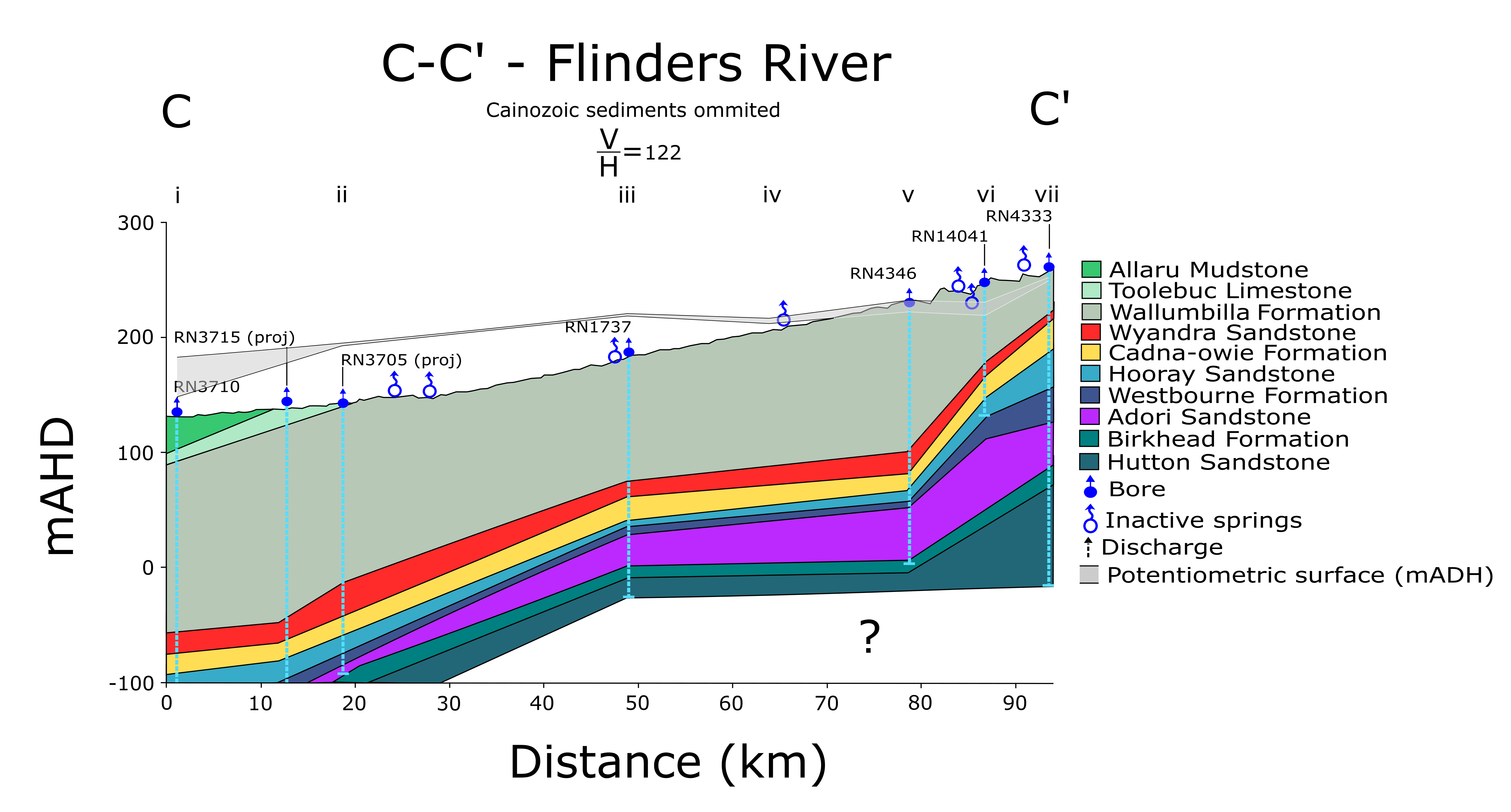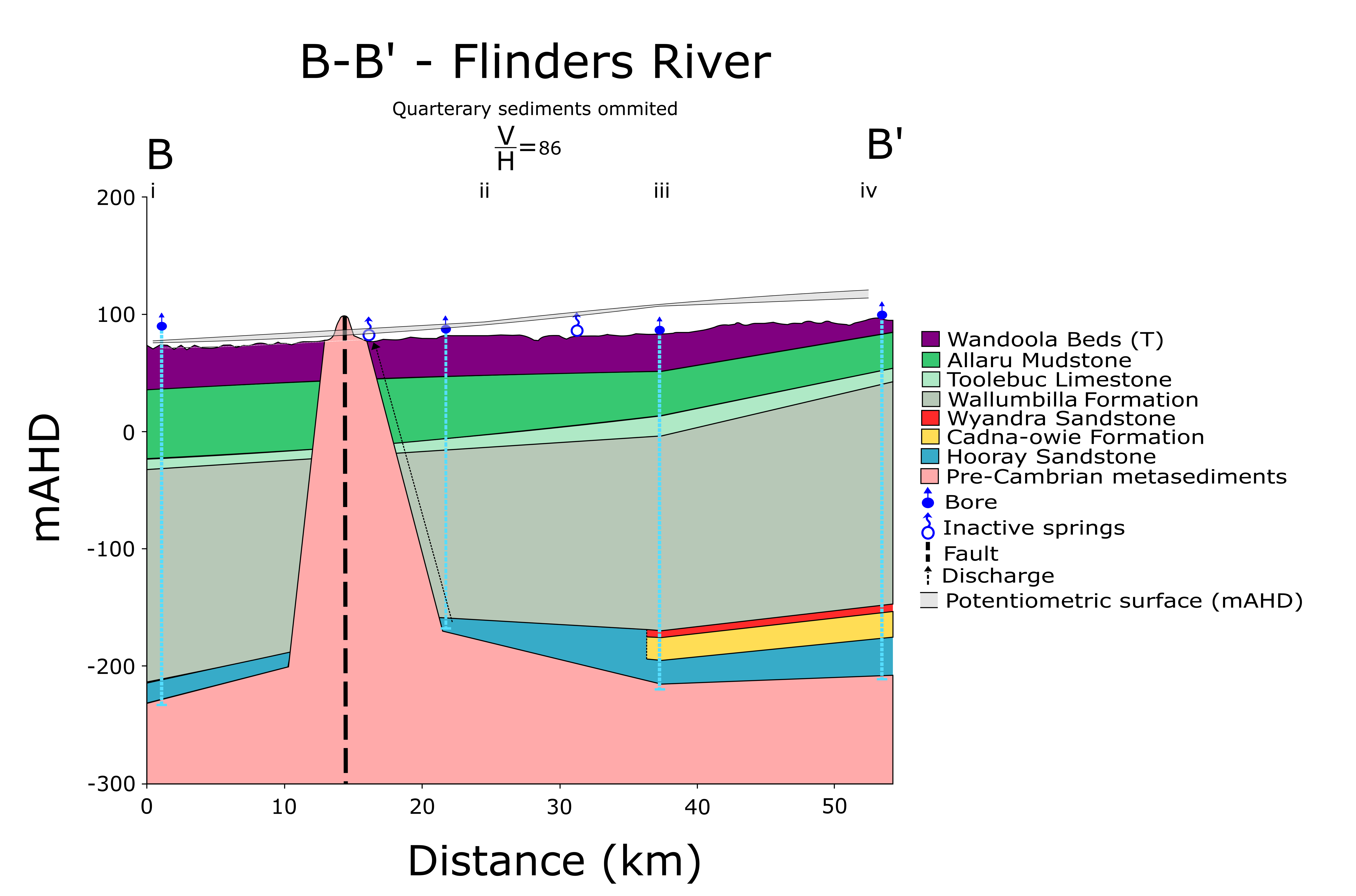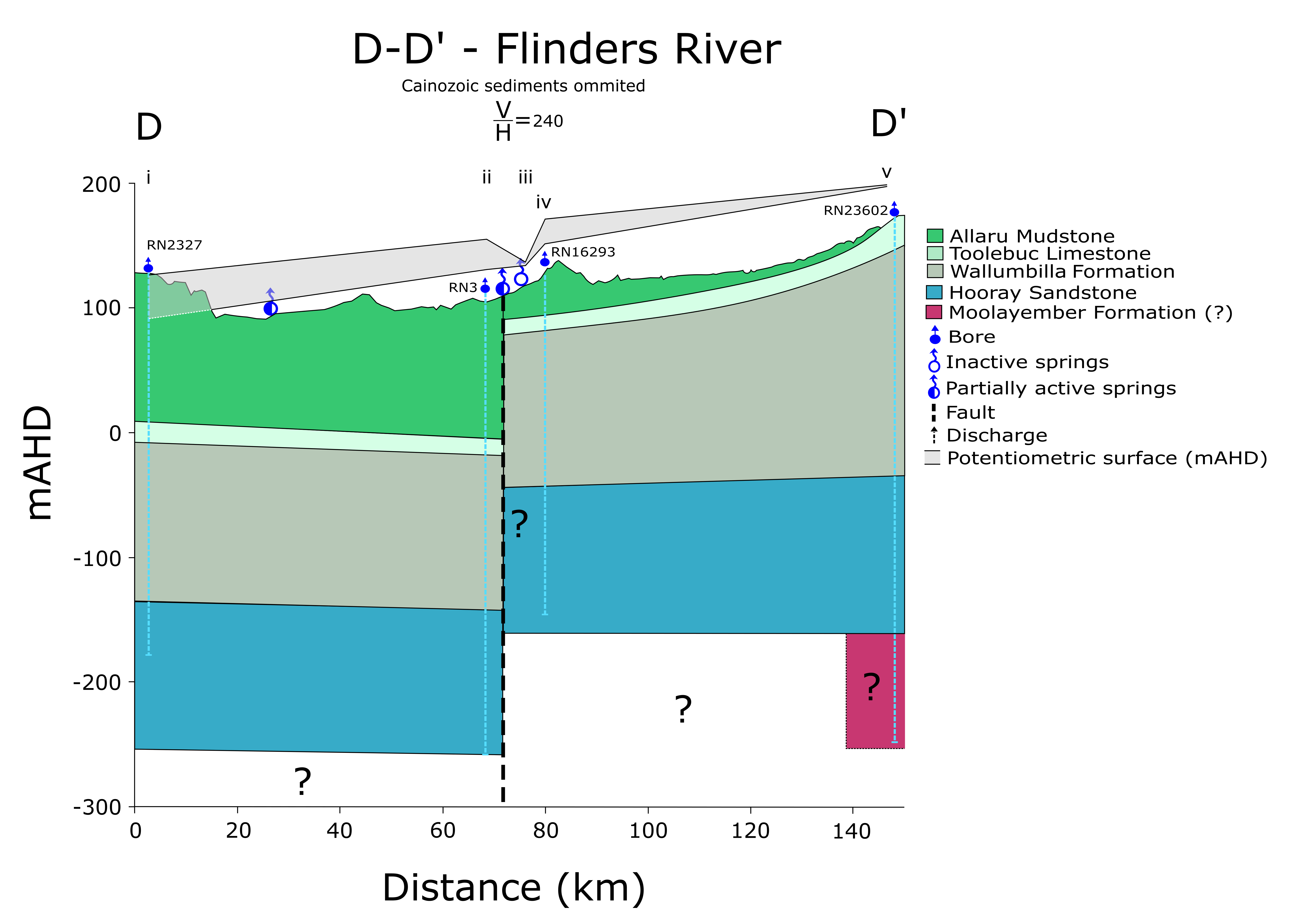 The Flinders River supergroup spans the Euroka Arch a basement structure partially separating the Carpentaria Basin from the Eromanga Basin. Granite provides the basement in the northern Eromanga Basin in the southwest of the supergroup and is exposed in a very limited area by the Kevin Downs Fault. The basement of the Carpentaria Basin in the vicinity of the springs are metamorphosed sediments and these Precambrian schists outcrop in the vicinity of springs at Mt Fort Bowen, Mt Brown and Mt Little. The Gilbert River Formation forms the lower unit of the Mesozoic sedimentary sequence and is the main water-bearing aquifer for the springs in this supergroup. Some stratigraphic sequences in bores describe Hooray Sandstone, Cadna-owie Formation and Wyandra Sandstone, but these units are synonymous with facies within the Gilbert River River. This sandstone is overlain by a sequence of Cretaceous units, the Wilgunyah Formation, the Toolebuc Member and the Allaru Member that act as aquitards. The Gilbert River Formation outcrops extensively in the eastern part of the Supergroup and there are many large outcrop springs, many of which are isolated in rugged ranges, providing baseflow for major streams including the Woolgar, Norman, Clara and Yappar Rivers.