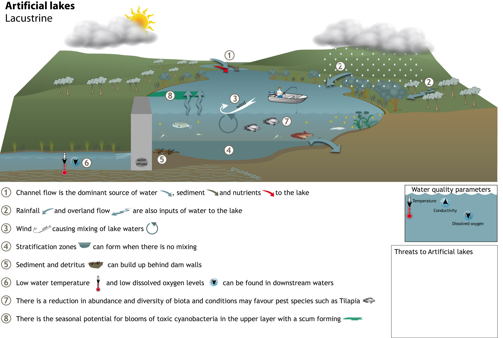 Lacustrine ecologyLacustrine wetlands (lakes) are dominated by open water. Although lakes may have fringing vegetation, the majority of the wetland area is open water. Dams and other artificial or modified wetlands often have similar characteristics to natural lacustrine systems in that they also have deep, standing or slow-moving waters. Lacustrine systems in Queensland, particularly in arid and semi-arid areas, are highly variable. Some are known to dry out and to support species adapted to these large changes while others stay wet for long periods and provide a refuge for many species during dry times. For more information about individual lacustrine habitat types in Queensland choose a wetland type conceptual model below. Quick facts