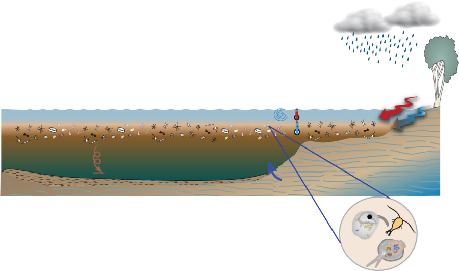 During periods of high surface flow into lakes, either through rainfall in the catchment and/or river flooding (if it is a floodplain lake), surface storm water flow is usually turbid compared to clearer groundwater base flows. This entering water is usually cooler than the well-mixed surface layer (the epilimnion) and warmer than the colder, deeper layer (the hypolimnion), and so settles between these two zones, blocking light to the water below and the bottom sediments. The turbid surface water entering carries nutrients and organic matter. These stimulate zooplankton growth and suppress phytoplankton growth by blocking light. The water column is typically heterotrophic at this stage. Following the turbid water inflow, particles settle over time according to size. As the particle size distribution changes over time, so do the zooplankton and microcrustacean species that graze on it (e.g. there is a shift in Daphnia species (small planktonic crustaceans) as particle size fractions change). Clear water also enters the lake through hyporheic flow if the lake is part of a floodplain system, is proximate enough to the flowing channel system and if the substrate is conducive to such flow. Stage 2