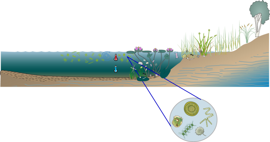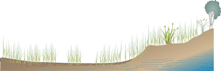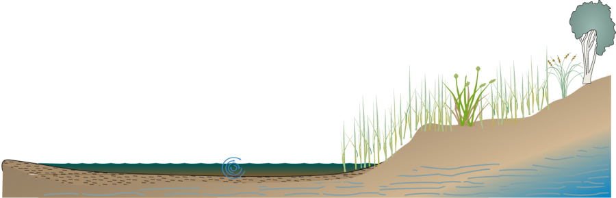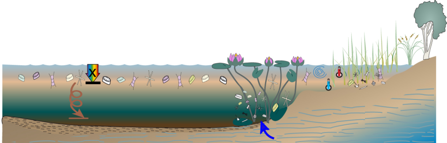 Over time, particles continue to settle out of the water column. Light could still be blocked by suspended particles and Coloured Dissolved Organic Matter (CDOM). However, unless there is a significant amount of resuspension (which can be caused by wave action), the water tends to become clearer to some extent. Emergent vegetation flourishes, providing a substrate for microbes and epiphytes to grow on and a source of detritus for other organisms. The depth is continually getting shallower due to evaporation, unless groundwater (including hyporheic flow) can supplement the water lost through evaporation. Lakes that receive groundwater can typically become clearer than those that don’t, as they are provided with a source of clear water that dilutes the sediment and organic matter particles over time. Stage 3