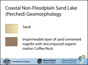 Perched lakes are formed when sand is cemented together with decomposed organic matter (such as leaves, bark and dead plants) and aluminium and iron, creating a relatively impermeable layer well above sea level. This cemented (or indurated) layer, known as ‘coffee rock’, tends to slow water from percolating down to the regional aquifer, holding rainwater in a depression, forming a lake (and associated swamp habitat). The geomorphology of perched lakes can be quite diverse and complex. The wetland environment that develops can depend on the topography, depth of the coffee rock, degree of cementation (induration), as well as its organic matter and metal content. The perched lake’s position in the landscape (e.g. in a deflation dune or a backswamp) also plays an important role in the formation and functioning of the perched lake. Commonly they are formed in saucer-shaped depressions in the dune surface with their own local water table that sits well above the large lens-shaped aquifer that may be associated with the greater sandmass system. However, further research is required to better understand these wetlands.