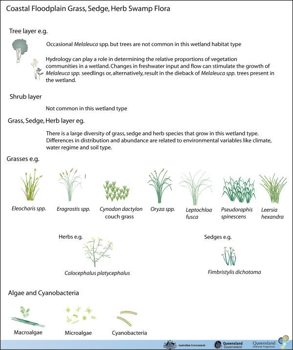 Coastal and subcoastal floodplain grass, sedge, herb swampCoastal and subcoastal floodplain grass, sedge, herb swamp – FloraClick on elements of the model or select from the tabs below As the name suggests, coastal floodplain grass, sedge and herb swamps are dominated by grasses (family Poaceae) and/or sedges (principally from the Cyperaceae and Restionaceae families) and herbs (from a variety of families). There is a general trend towards grass dominating in the north (Gulf of Carpentaria catchments) and sedges dominating elsewhere (east coast catchments), but rainfall and other factors also play a part. Herbs tend to be more abundant in cooler areas, where there is winter rainfall. Sometimes grass and sedge herb swamps can be dominated by a single species or genus (e.g. Eleocharis spp.) while in other locations, this wetland habitat type can exhibit a greater species diversity. Occasional trees and shrubs may be encountered, especially along traversing channels. However, vegetation rarely exceeds 2 m in height and is mostly below 1 m. The vegetation communities include both perennial and annual plants. At the driest time of year, some floodplain grass, sedge and herb swamp habitats may display a persistent cover of erect (though partly collapsed) vegetation whereas others may have little, if any, erect vegetation. Algae and cyanobacteria (blue-green algae) growth can follow a wet flush/local rainfall. See aquatic habitat for species that occur in deeper parts of these habitats.