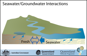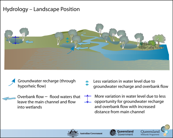 The hydrology of floodplain grass, sedge, herb swamp is related to a site’s local topography, substrate type and position within the catchment. Climatic factors (especially those related to rainfall) also play a significant role in the regularity, seasonality, duration and amount of water entering and leaving the wetland. Water InputsFloodplain wetlands can be flushed with water from overbank flow, streams leading directly to the site, sheet flow across the floodplain, rainfall, run-off from the local watershed, hyporheic flow and from sea water/groundwater interactions, or a combination of these sources. If groundwater table levels and substrate permeability permit, this can lead to more constant systems. This wetland habitat type can play a role in groundwater recharge/discharge. An important point to note is that hyporheic flow and groundwater flow tend to be clear (not turbid), compared to surface water flow. Water Outputs