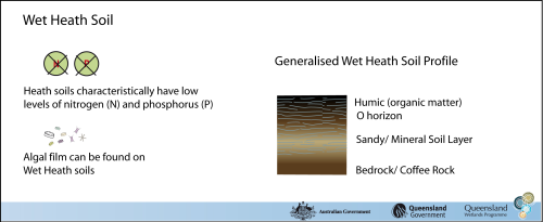 Floodplain shrub swamp habitats occur on seasonally waterlogged Quaternary alluvial plains along coastal lowlands. These are related to coffee rock in the dune systems, hard pan, and areas of water table discharge. Wet heath, in general, are non-floodplain systems. Floodplain heath swamp habitats do exist and are found within a floodplain context, with alluvial soils, and receive water from overbank flow and are therefore an exception to the general rule.