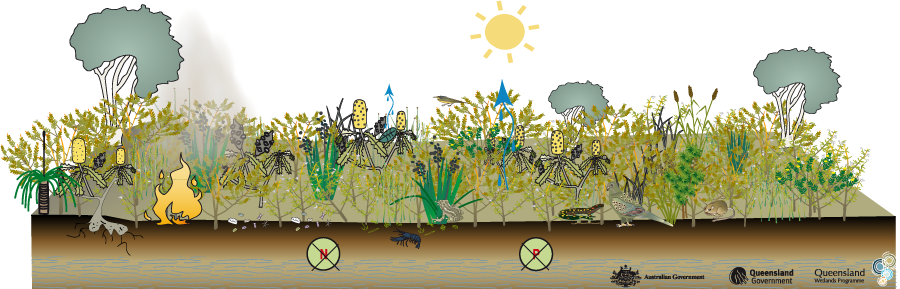 Coastal and subcoastal non-floodplain wet heath swampCoastal and subcoastal non-floodplain wet heath swampClick on elements of the model or select from the tabs below Last updated: 22 March 2013 This page should be cited as: Department of the Environment, Tourism, Science and Innovation, Queensland (2013) Coastal and subcoastal non-floodplain wet heath swamp, WetlandInfo website, accessed 15 December 2025. Available at: https://wetlandinfo.detsi.qld.gov.au/wetlands/ecology/aquatic-ecosystems-natural/palustrine/non-floodplain-heath/ |