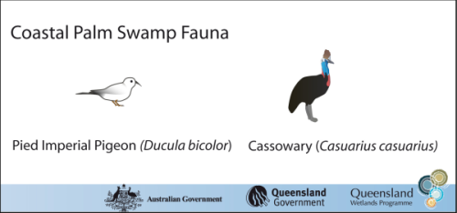 There are very few animal species associated with this wetland habitat type. The Pied Imperial Pigeon (Ducula bicolor) and Southern Cassowary (Casuarius casuarius) are two notable examples. Both rely on palm fruits for at least a part of their diet; Pied Imperial Pigeons favour palm trees as nesting sites. Last updated: 22 March 2013 This page should be cited as: Department of the Environment, Tourism, Science and Innovation, Queensland (2013) Coastal and subcoastal tree swamp—Palm – Fauna, WetlandInfo website, accessed 15 December 2025. Available at: https://wetlandinfo.detsi.qld.gov.au/wetlands/ecology/aquatic-ecosystems-natural/palustrine/palm-swamp/fauna.html |