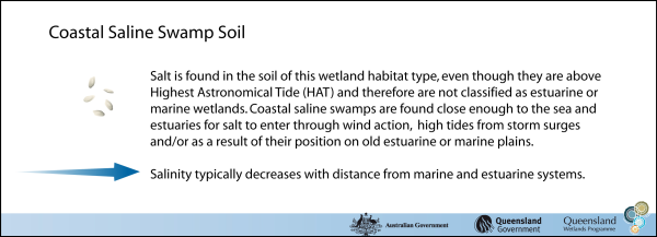 Saline swamps are found on the more saline end of the palustrine spectrum, located in generally flat, low-lying coastal areas near estuaries and the sea. The geomorphologic setting for coastal saline swamp habitats tend to be depressions on old Quaternary estuarine deposits, minor basins, small depressions and poorly drained flats on marine or alluvial plains with gentle or minimal slope. Coastal saline grass-sedge wetlands adjoin or merge with a wide range of other wetland types. On marine plains, they lie between saltmarsh and mangrove estuarine wetlands and upland (non-wetland) ecosystems; on alluvial plains they may lie between river channels/levees and the high ground at the floodplain edge. They may be surrounded by infrequently inundated floodplain. Often they occur patchily within complexes of wetland types such as floodplain or non-floodplain tree swamps (coastal melaleuca swamps in particular) and braided river channels. Frequently, the boundaries of each type are not clear and may change over time as determined by patterns of rainfall and flooding.