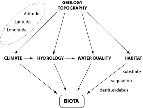 IntroductionThere are two broad approaches to regionalisation. The first uses patterns of landscape drivers influencing aquatic ecosystems (e.g. stream flow, temperature, soil type) to define areas where systems would be expected to be similar. The second approach uses geographic patterns in ecosystem biota (e.g. fauna such as macroinvertebrates and fish) to regionalise large areas and has been successfully implemented in Victoria, Australia[3][2]. The riverine conceptual models presented in this section deal solely with naturally occurring processes and do not focus on anthropogenic (human) impacts. The major natural processes which drive the physical (e.g. flow regimes, temperature, habitat availability) and chemical (e.g. pH, Nutrient concentrations) composition of the river systems and consequently determine the biota of the province. The major subgroups are: Climate, Geology and Topography, Habitat, Hydrology, and Water Quality (see diagram). This is a bottom-up classification that assumes local biota reflect the biophysical properties of a region. These conceptual models focus on natural ecosystems and the physical processes driving them. Riverine conceptual models![]() The riverine conceptual models are aimed at assisting water management decision making by demonstrating our conceptual understanding of Queensland’s freshwater riverine ecosystems. It provides a useful spatial framework within which to assess ecological data and information required for natural resource management. The specific objectives of the riverine conceptual models are to identify the: