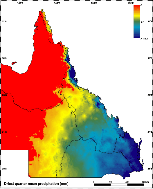 Last updated: 22 March 2013 This page should be cited as: Department of the Environment, Tourism, Science and Innovation, Queensland (2013) Driest quarter mean precipitation, WetlandInfo website, accessed 15 December 2025. Available at: https://wetlandinfo.detsi.qld.gov.au/wetlands/ecology/aquatic-ecosystems-natural/riverine/freshwater-biogeo/background/qld-driest-quarter-precip.html |