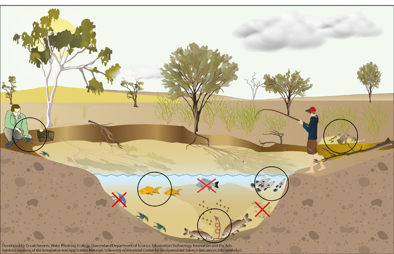 Aquatic pest species can establish in freshwater environments via deliberate stocking, recreational activities (live bait), stocked farm dams and aquarium escapees, or accidental transport.