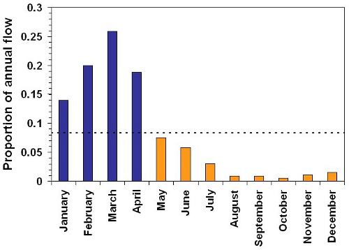 Wet and dry seasonsThe proportion of annual flow is not distributed evenly between months. The months January to April have a much greater proportion of annual flow than May to December. Based on this the wet season for the Lake Eyre and Bulloo FBP is January to April and the dry season May to December.