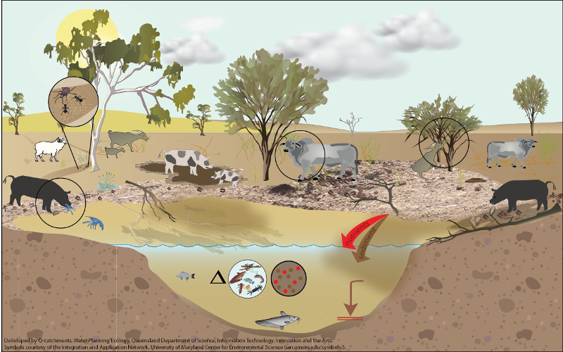 Feral animals and livestock can damage riparian zones, banks, edge habitat and dry stream beds while accessing water and other resources. Pugging, rooting and trampling can accelerate erosion and alter instream sediment dynamics. Soil compaction can also occur along stock trails, reducing water infiltration whilst increasing run-off.