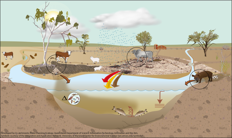 Increased deposited sediment smothers instream habitat and reduces waterhole persistence time through depth reduction.
