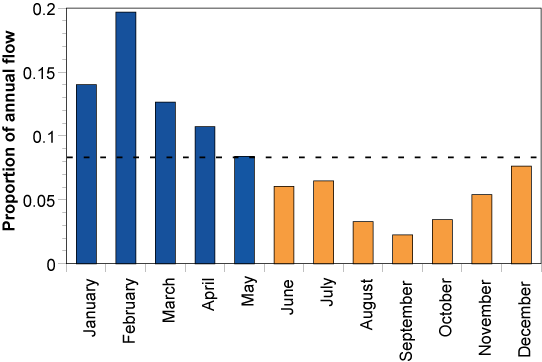 ![]() The dashed horizontal line represents the proportion of mean total annual flow in each month if it were equal for all months. The wet season is defined as months with a higher proportion than this (blue bars) and the dry season (orange bars) as months with a lower proportion.