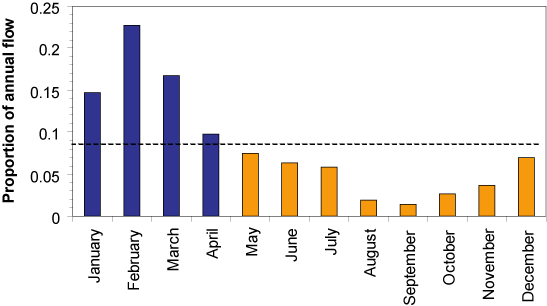 Information about base and flood flow Magnitude of spatesMagnitude of spates averaged 0.7 to 1.1 Ml km2 day-1, but much larger and smaller average values occur within the FBP at particular sites. There is an average of 4.5 to 4.7 spates per year, with 2.5 to 2.7 of these in the wet season and 1.9 to 2.1 in the dry season. The average duration of spates is approximately 8.2 to 8.6 days. The timing of spates is not limited to the wet season so biota that utilise spates for some part of their life history are able to be opportunistic in that they are not confined to do so during only part of the year. The mean number of spates per year in the South-East is high with respect to other FBPs and they are typically shorter in duration. This suggests that the rate of rise and fall of spates is fairly rapid in the South-East. This also implies that spates are a fairly high disturbance to biota in these systems. Information about magnitude of spates