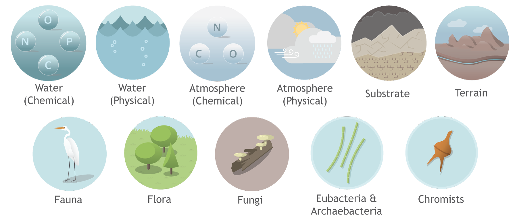 Plants, animals, soils, water and more (components)The various parts of an ecosystem are called components. Ecosystem components include the physical, chemical and biological parts that make up the environment. Examples include the water within a wetland, the chemicals within that water, the vegetation types at a wetland, animals and microbes that live in a wetland, the geology, terrain, soils or sediment of a wetland, or the wetland itself (adapted from[2][3][1]). Understanding wetland ecology involves identifying the components of a wetland, and how these components function and interact, at the ecosystem scale, and within the context of the surrounding landscape or seascape. The interaction between the components and processes provides the ecosystem services that people value. Components in the landscapeTo understand where components are in the landscape, components are organised into the following themes: