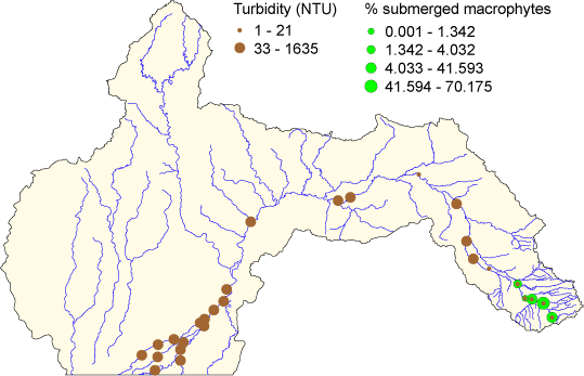 Aquatic macrophytes and turbidity—A case studyThe distribution of macrophytes within the Condamine-Balonne River in the Murray-Darling FBP[2] shows that submerged species are limited to the upper catchment where turbidity is comparatively low. However, species of macrophytes with floating leaves or emergent growth forms are found throughout the catchment. The distribution of submerged macrophyte is probably limited by turbidity. Quick fact?