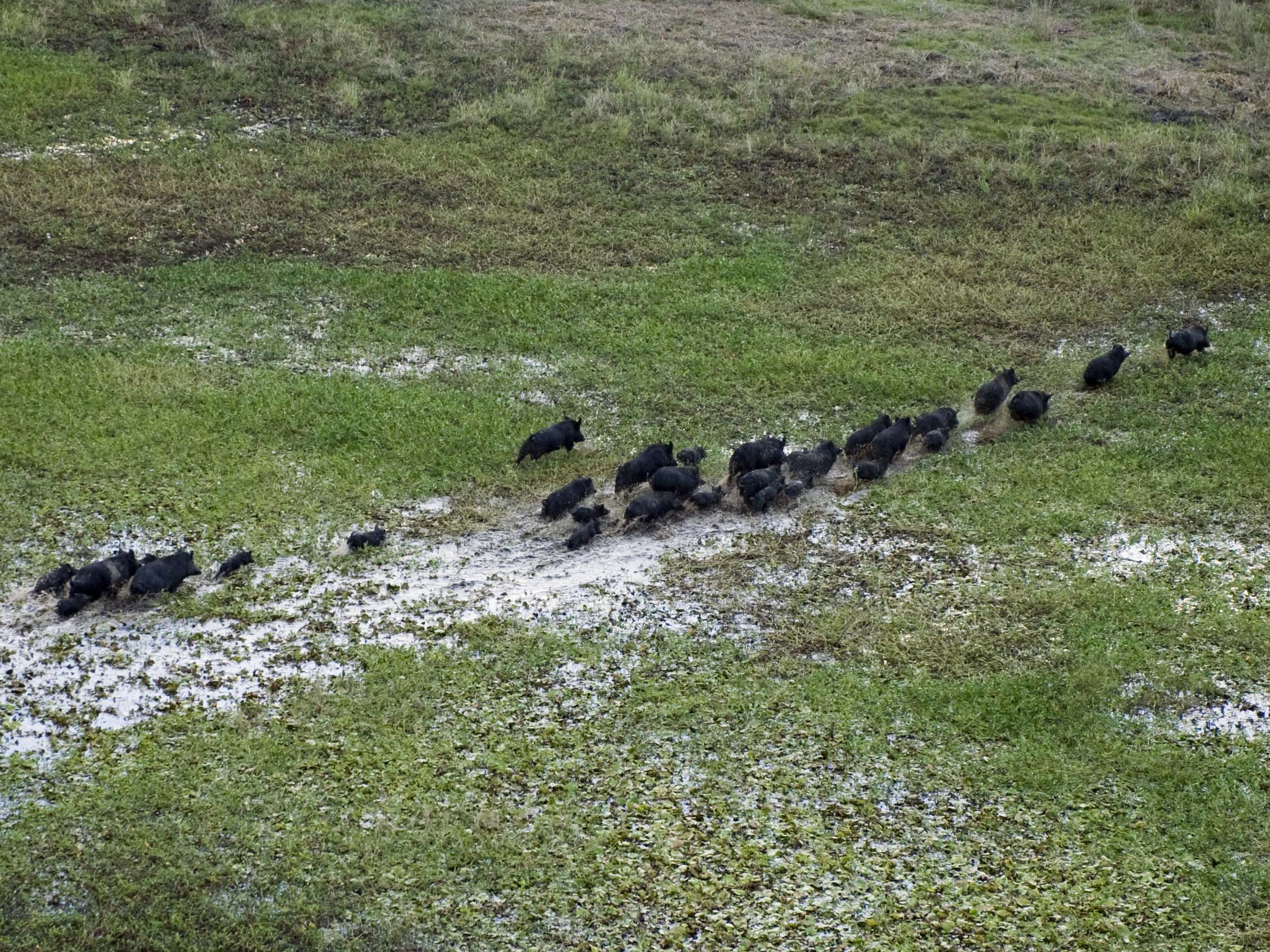 Feral pigs live in matrilineal groups known as “sounders” or “mobs” that are comprised of female pigs, their offspring, sexually immature juveniles, and other female related sows (e.g. aunts, sisters, etc.)[8]. Sounders are generally territorial but can have overlapping home ranges with other sounder groups[8]. Sounders of females, piglets, and juveniles tend to have smaller home ranges than solitary boars[3].