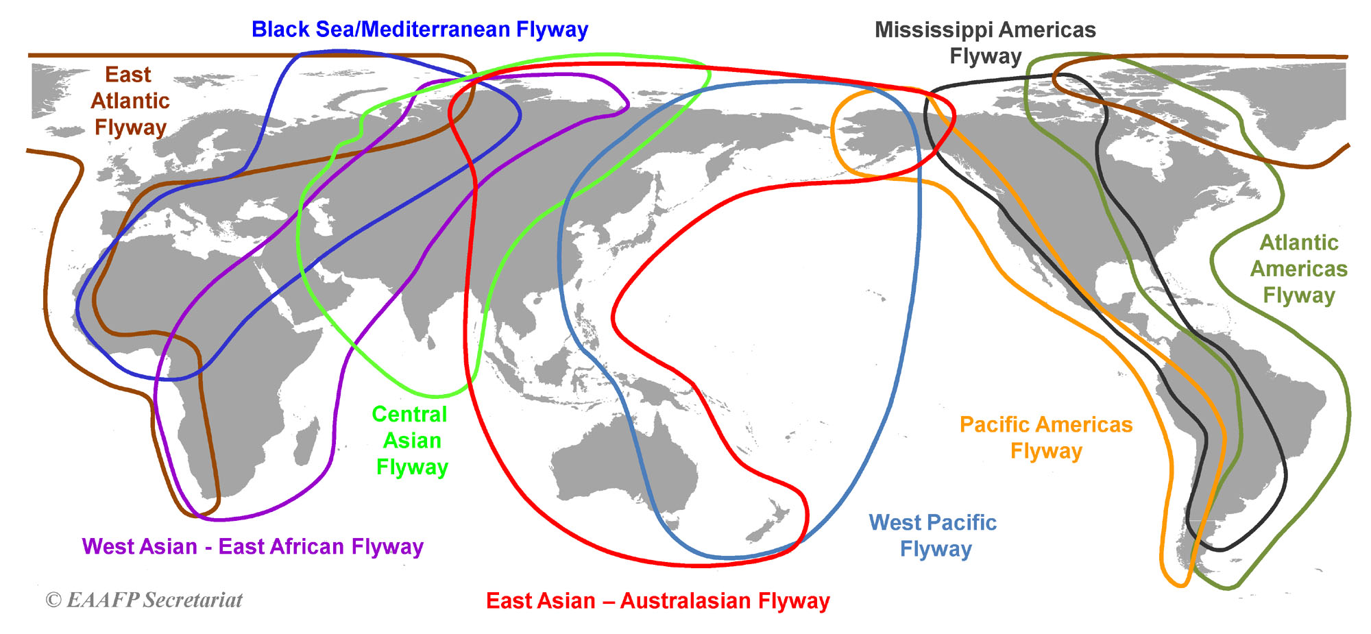 The East Asian–Australasian Flyway includes a complex of many islands and ocean crossings, spans many countries and contains nearly half the world’s humans. Areas of the Flyway are subject to large-scale, rapid economic development and consequently many waterbird populations in this flyway are threatened or in decline. More information is available on the cooperative management of shorebirds and their habitat under the East Asian–Australasian Flyway Partnership (EAAFP). Additional information