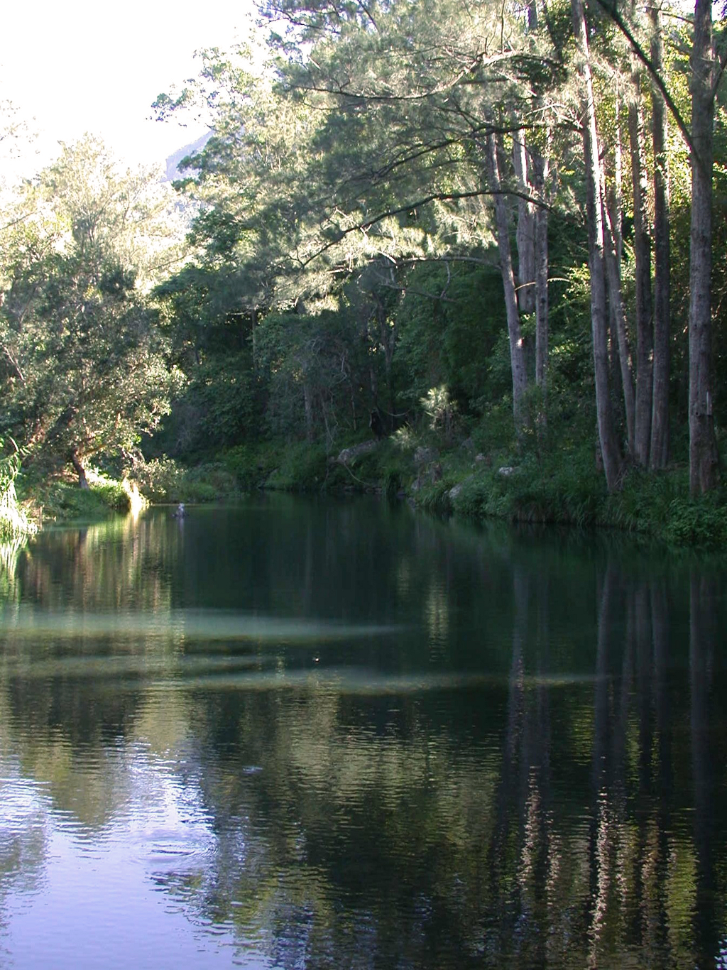 ShadeDepending on the composition of the riparian zone it may provide ample shade for the water, reducing the amount of light and heat reaching a stream. For some provinces (e.g. Murray-Darling and Central), the sparse vegetation in the riparian zone does not give much shade. In other systems the reduction in light results in a reduction in the abundance and possibly species richness of algae and macrophytes that may otherwise be present, ultimately decreasing in-stream primary production as well as water temperature. These shading effects are more influential in the upper reaches of a stream system where the stream channel is narrow. The effect of shade on temperature in large, wide channels may be negligible. Fish utilise shade as an area of cover from which to launch predatory attacks, as well as a refuge from predation[10].Pusey and Arthington (2003)[2] suggest that increased rates of transfer of thermal energy between the atmosphere and stream in the absence of an intact riparian zone may disrupt reproduction of fish, and have direct effects on mortality rates, body morphology, disease resistance and metabolic rates in fish. Riparian vegetation influences the spectral qualities of light entering the stream[10]. Changes in light quality can lead to increased mortality of fish eggs and larvae due to increased ultraviolet light irradiation, reduction in the ability of adult fish to discriminate between potential mates, and increased conspicuousness to predators[10]. Nutrient and debris inputsBoth direct and indirect inputs are provided to the stream by riparian vegetation. Depending on the type of riparian vegetation it may deposit fruits, leaves, bark, large woody debris and/or snags into the stream. These inputs supply nutrients to the stream food chain. Terrestrially derived matter is consumed directly by some fish[10] and macroinvertebrates, and may be an important source of energy to some systems. It should be noted that in some systems (e.g. those dominated by grasses) the riparian zone may not provide many nutrients to the water. When leaves derived from riparian vegetation first enter a stream, the soluble components undergo leaching. Fungi and bacteria then condition the leaf material, before macroinvertebrate shredders consume fragments of the leaves. The seasonality of leaf inputs, the volume, and the chemical composition of the leaves are determined by the species that occur in the riparian zone. Native vegetation, such as species of Eucalyptus, Acacia, and Melaleuca, have sclerophyllous leaves, which may persist for months or years before completely breaking down. Herbaceous material, such as grass litter, breaks down very quickly in streams. A sclerophyllous input ensures a continuous food resource for stream organisms, whereas herbaceous inputs may not be as consistent throughout the year[11]. Riparian zones dominated by exotic vegetation such as the willow (Salix sp.) supply an autumn-dominated energy input to the adjacent stream, providing only a brief food supply for aquatic organisms[4]. Litter fall in Australian forests tends to be continuous throughout the year, with a peak in summer[6][7][3]. Some streams in Queensland are fringed by the exotic camphor laurel (Cinnamomum camphora), the leaves of which contain camphor, camphorene, and reticuline, which may be unpalatable to stream consumers[5]. As a result, these leaves take a significant period of time to break down[11]. Debris from riparian vegetation provides habitat for stream organisms, e.g. the caddis fly larvae (Calamoceratidae) binds pieces of leaf material together to produce a mobile home. Some Leptoceridae, another type of caddis fly larvae, utilise hollowed-out sticks derived from riparian vegetation. Leaves, bark, large woody debris and snags also provide cover for fish and macroinvertebrates, and are a substrate for diatom and algal attachment. Riparian vegetation influences the interception, storage and release of terrestrial nutrients. The riparian zone acts like a 'filter', reducing the amount of nutrients and suspended sediments carried in run-off destined for the stream. Additionally, riparian zones can minimise flood peaks following heavy rainfall[1]. Micro-biological processes, such as denitrification, occur in the riparian zone. HabitatVegetation in the riparian zone, such as grasses, can provide spawning habitat for fish when inundated. The velocity of flood water can be slowed by large woody debris and trees forming eddies and backwaters, which may also provide favourable spawning sites for fish that are cued to spawn during high flows.Vegetation provides habitat for terrestrial insects, which indirectly results in inputs to the stream when these insects drop from overhanging vegetation into the water and become food for other invertebrates, fish and turtles. Some of these insects may have originated from the stream. Many insects encountered in a stream are larval or immature, and they eventually emerge from the water as winged adults. The riparian zone provides a corridor for the movement and dispersal of these winged adult insects. The distributional patterns of riparian flying insects are influenced by the density of riparian vegetation, and can vary with height, distance from the stream, and season. Riparian vegetation provides nesting sites for waterbirds. Flooded lignum (Muehlenbeckia florulenta), for example, is an important nesting habitat for waterbirds including colonial waterbirds and the freckled duck[13]. Bank stabilisationRiparian vegetation also serves the function of bank stabilisation, reducing erosion. The roots of riparian plants bind the stream bank and help to reduce slumping, allowing the bank to become undercut without collapsing[1]. These under-cut areas are habitat for fish and macroinvertebrates, and exposed tree roots may be used as a spawning substrate for fish[9]. Woody debris and snagsLarge woody debris (LWD) refers to whole trees, logs, branches and sticks that