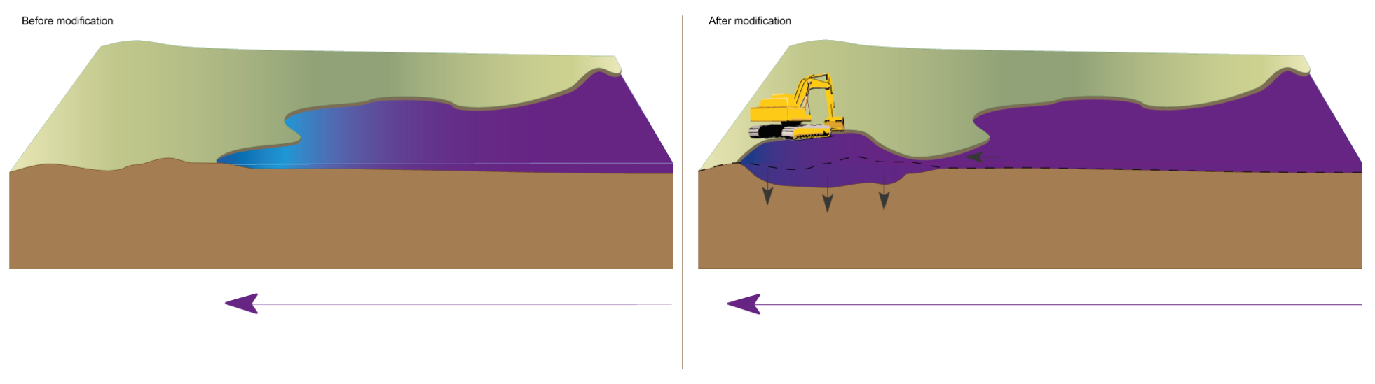 Excavation – Excavation creating an artificial wetlandSelect from the tabs below Excavation forming an artificial palustrine or lacustrine wetlandExcavation outside natural and/or modified natural wetlands is often intended to capture overland flow (i.e., surface water runoff) and may create an artificial palustrine or lacustrine wetland. Applicable Wetland Habitat Hydrological Modification: