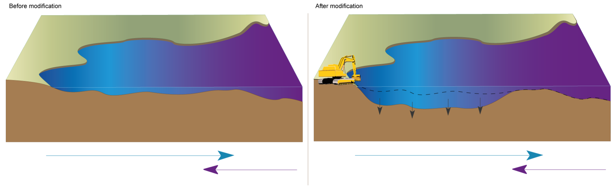 Excavation – Excavation outside a channelSelect from the tabs below Excavation in a palustrine or lacustrine wetlandExcavation in a palustrine or lacustrine wetland increases the extent and/or depth and may increase the persistence of water in the wetland. In some cases, excavation in a palustrine wetland may increase wetland extent and depth to such a degree that the wetland is converted to a lacustrine wetland system. Applicable Wetland Habitat Hydrological Modification:
