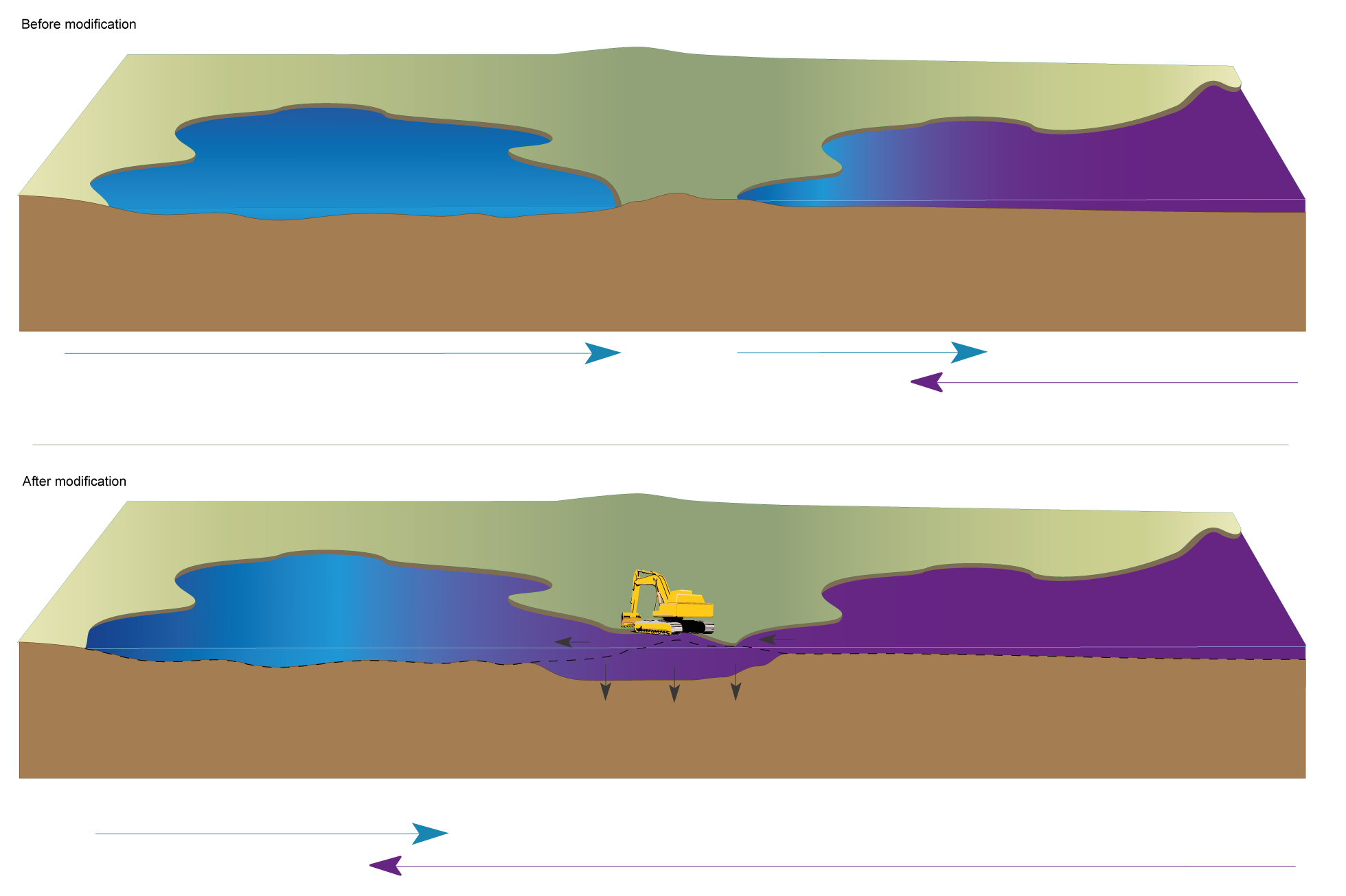 Excavation causing conversion to an intertidal wetlandExcavation in a palustrine or lacustrine wetland increases the extent and/or depth of the wetland but also enables tidal inundation. The wetland is converted to an intertidal wetland. Applicable Wetland Habitat Hydrological Modification:
