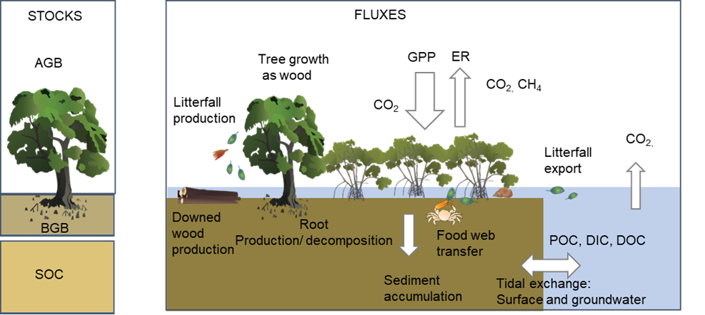 Figure 1 - Carbon fluxes in tidal wetlands. Stocks are the carbon stored in the long-term (carbon density per area) and fluxes are processes that involve the conversion of one form of carbon to the other (carbon per area per unit of time). GPP is gross primary productivity (or CO2 fixed), ER is ecosystem respiration (CO2 and CH4 released); POC is particulate organic carbon (e.g., leaves), DOC is dissolved organic carbon (e.g. amino acids) and DIC is dissolved inorganic carbon (e.g. carbonates). Carbon and the oceansAtmospheric carbon forms carbonic acid when combined with water and falls to the surface as rain. This contributes to chemical weathering of rocks, which results in the transport of different elements and ions to the ocean. In the ocean, the calcium ions combine with bicarbonate ions to form calcium carbonate - used by shell-building organisms (oysters, mussels), corals and plankton (which absorb carbon into their cells). Over time, the remnants of these organisms cement together and turn into rock (such as limestone). Chemical processes regulate this cycle between ocean, land, and atmosphere. Around 30% of carbon dioxide in the atmosphere is diffused into the ocean through chemical exchange. Carbonic acid is now slightly changing the pH of the ocean. The reaction in the ocean between carbonic acid and carbonate ions can impact the carbonate ions available for shell building organisms, and the acidity of the ocean weakens marine organisms shells. Carbon in the oceans increases the growth of phytoplankton and ocean plants (such as seagrass). Carbonic acid reacts with, and dissolves, biogenic carbonates – see Intertidal and Subtidal Substrate Composition. Links and referencesPages under this sectionReferences