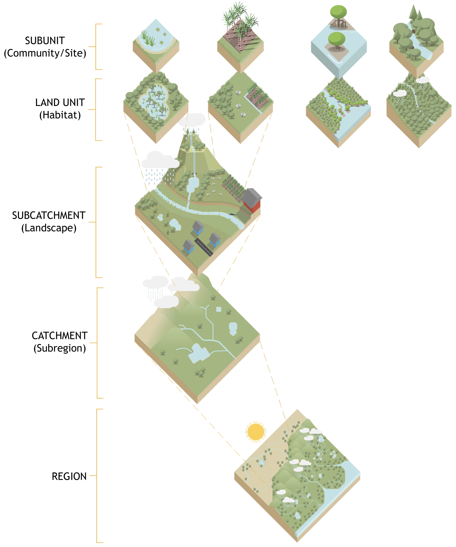 RegionA region is an area that experiences similar rainfall, temperatures and weather patterns (e.g. wet tropics). Catchment (Subregion)Larger catchments are made up of smaller subcatchments, which form tributaries to the main watercourse within the catchment. The degree to which the overall catchment affects a smaller subcatchment depends on the degree of connection, through features such as floodplains, where parts of the subcatchment are inundated, during a flood event or through groundwater flows or stream flows. A catchments hydrology is influenced by the region in which it is located. Subcatchment (Landscape)A subcatchment's rainfall, topography and geology are the main influences on the water regime of a subcatchment, including the duration and timing of local runoff, channel inflows, flooding, precipitation and groundwater flows from the broader landscape. Land unit (Habitat)Some land units will have very simple hydrology, e.g. upland rainforest receives rainfall and lose water by evapotranspiration, infiltration or runoff. Others, such as wetlands, lower in the landscape, will have complex interactions of local and catchment runoff, groundwater flows, infiltration and evapotranspiration. Subunit (Community/Site)A subunit is part of a land unit which may be different than other parts of a land unit, for example, a particular plant community, or flow paths within a wetland. Additional Information