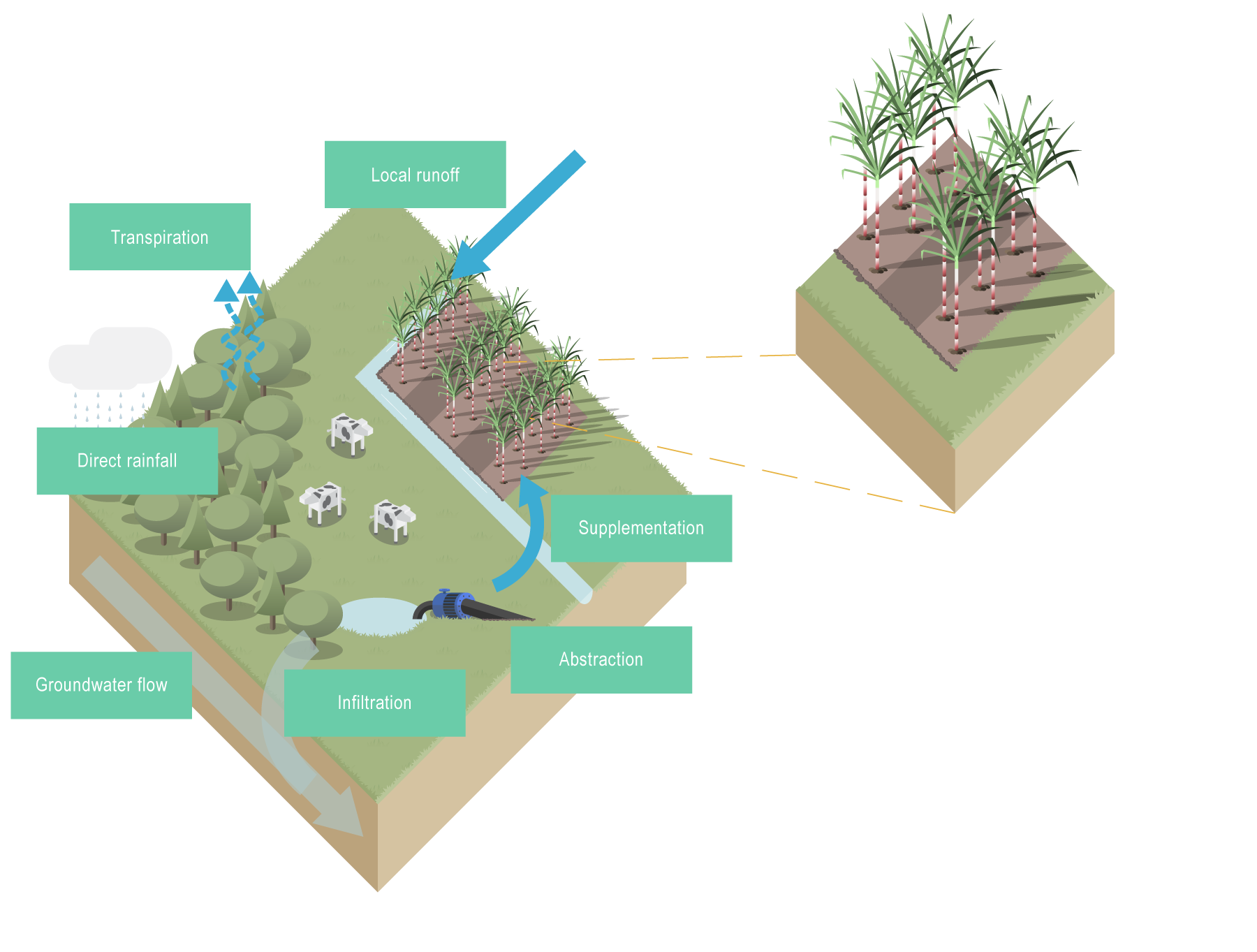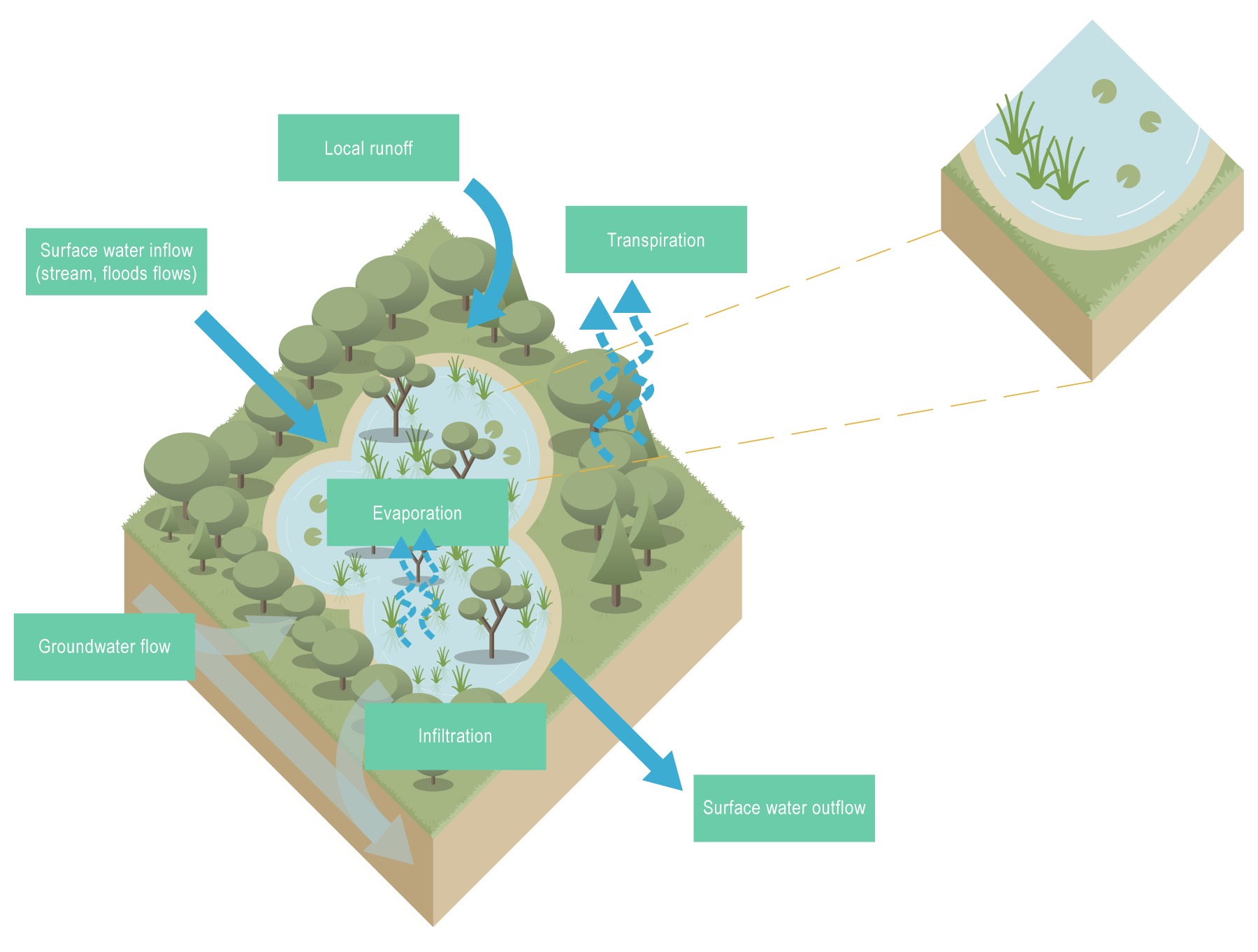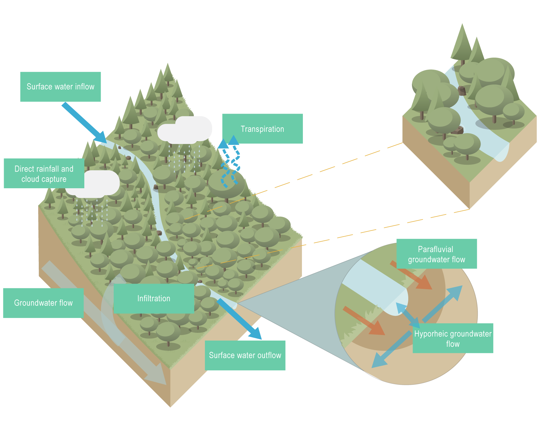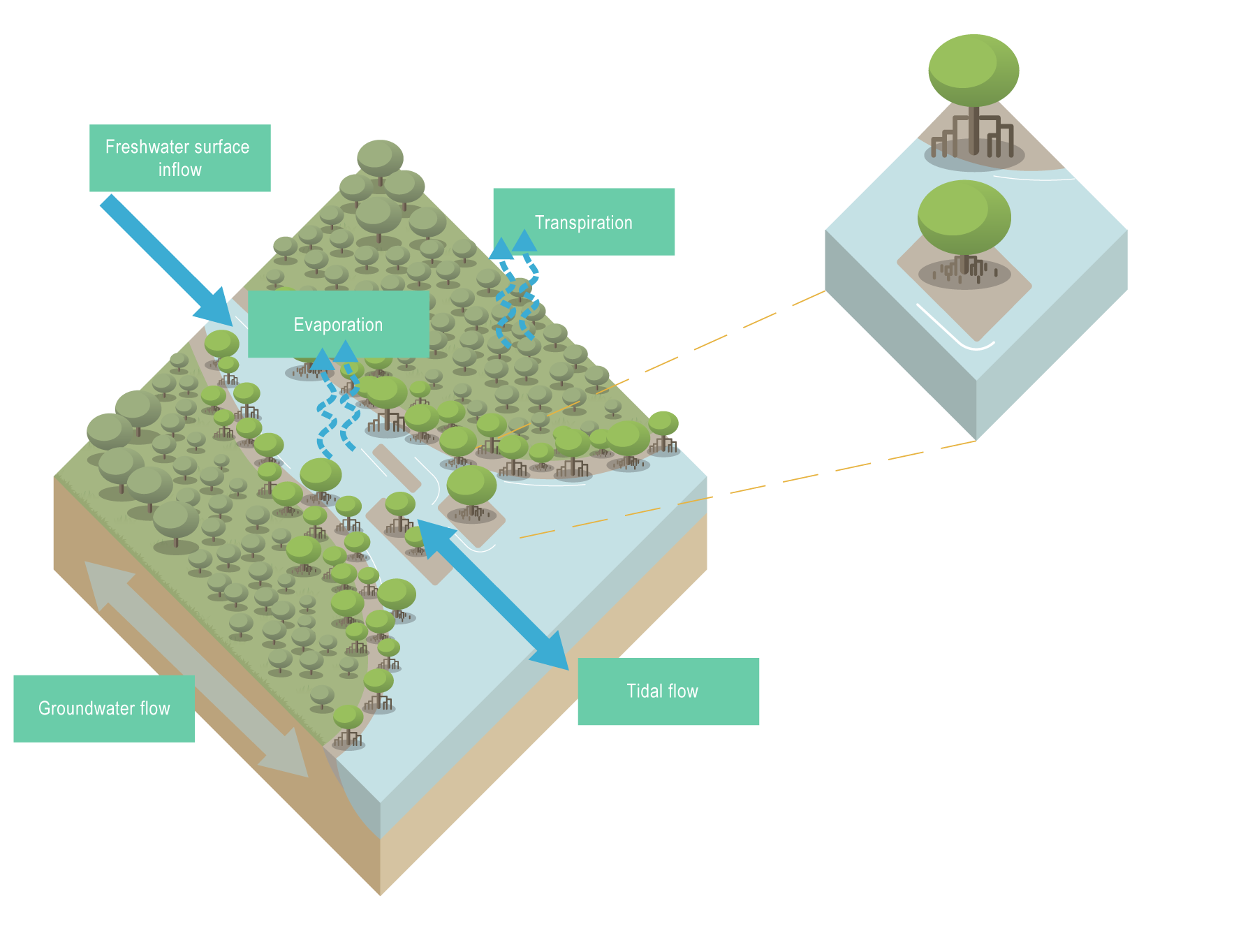 Catchment and subcatchment hydrology, position in the landscape, modifications and prior conditions combine to determine the inflows and outflows of a habitat or land unit. Surface and groundwater may flow into and out of land units continually or periodically. This water may originate in the land unit as rainfall or cloud interception, or pass through it from elsewhere in the catchment in streams, drains, irrigation, floodwater or aquifers. At the land unit scale the processes of evaporation and transpiration also occur. Rainfall reaches a stream via surface runoff or overland flow across the surface of the land toward a surface water body, through shallow groundwater, and via infiltration into the soil and percolation into deeper groundwater which enters the stream and contributes to baseflow. The water then becomes stream flow – also known as channel runoff, the flow of water in natural watercourses such as streams, creeks, and rivers. Water can also seep from deep underground aquifers to the surface when its pressure is great enough. Water flowing through a river can move through the sediments beneath and adjacent to the channel. These are termed hyporheic and parafluvial flows respectively. Groundwater is water that has infiltrated beyond the unsaturated soil, or root zone (where plant roots generally occur) and percolated down to the saturated zone. The percolation of water depends on the nature of the landscape, including the type of soil and rock layers present, and how permeable they are (i.e. pores between grains and fractures in rock)[2]. Water abstraction is the physical removal of water from a water resource for use. It includes both surface water and groundwater sources. Supplementation, often in the form of releases of stored water (e.g. from dams) for irrigation can increase base flows in streams and extend periods of wetting for wetlands[1]. Tidal estuaries and creeks receive water from the ocean via tidal inflows. Larger estuaries can receive significant freshwater runoff from the catchment while small creeks may have very little freshwater. The quantity of freshwater input can vary seasonally, depending on regional climatic conditions. Groundwater input may also be a significant source of freshwater. Tidal creeks typically have well-mixed water circulation conditions, due to the mixing effect of strong tidal currents. The tidal range within tidal creeks may be amplified in comparison to the adjacent coastal ocean (depending on the geometry of the channel), and tides also tend to penetrate further inland with increasing tidal range. References