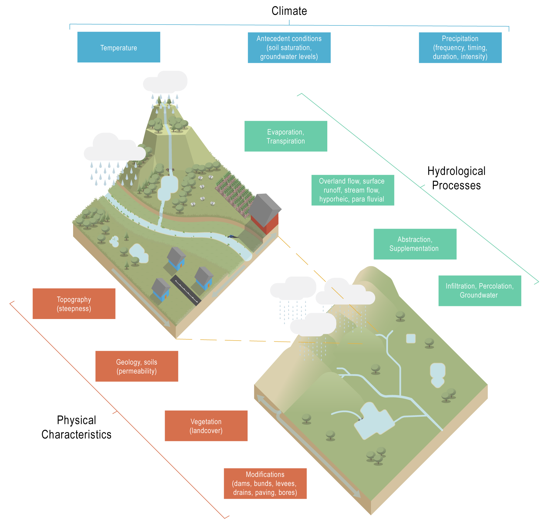 The hydrological processes of a catchment or subcatchment are influenced by the physical characteristics of the catchment as well as by the broader region and subregion. Subcatchments are also separated by a raised ridge or natural boundary within a catchment. In general, surface water does not flow from one subcatchment to another, however in relatively flat areas flood waters may cross a subcatchment boundary. In some cases, groundwater may cross subcatchment boundaries due to the underlying geology.