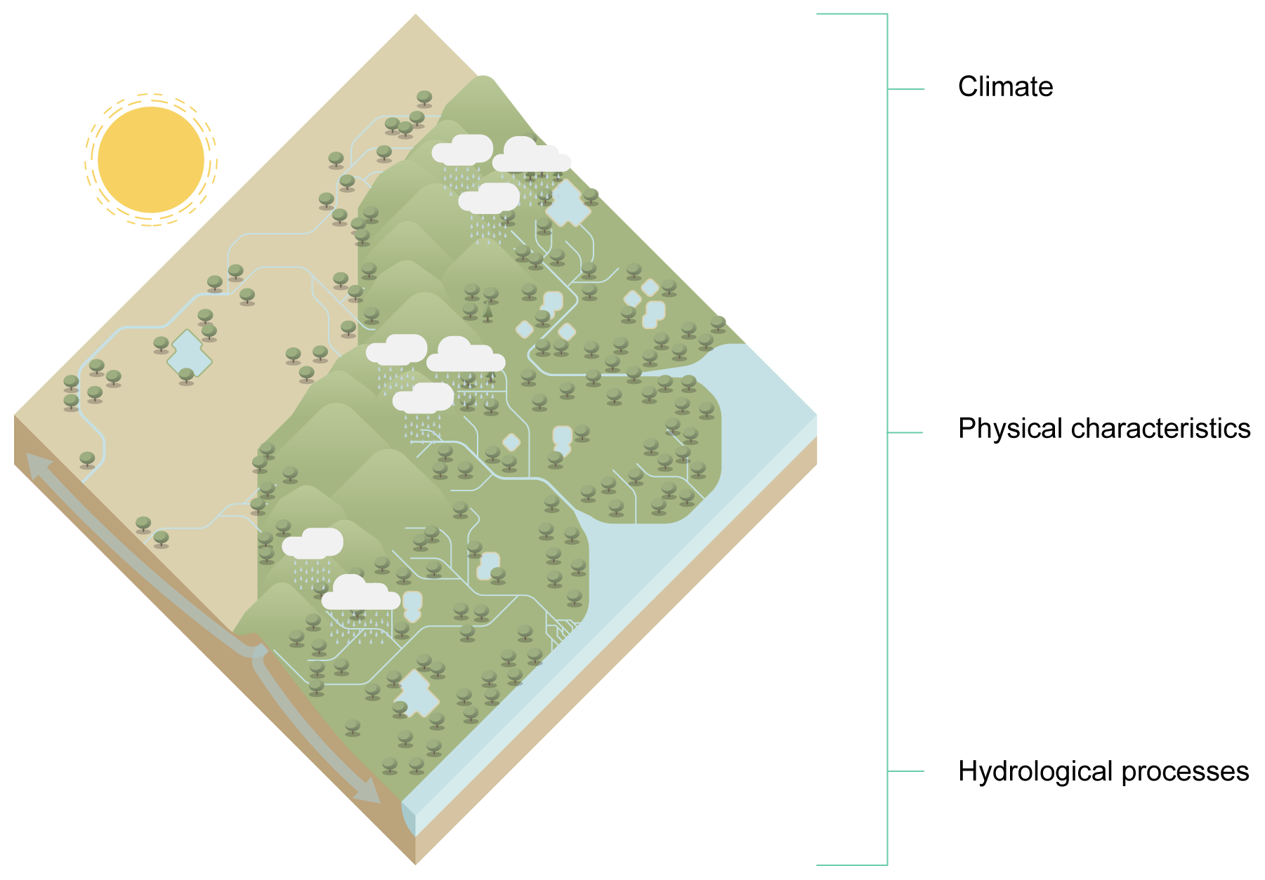 ClimateClimate is a major determinant of hydrology, and it interacts with the landscape to determine hydrological characteristics. Physical characteristicsThe hydrological character of a region is also highly dependent on the physical characteristics such as geology, topography, and the drainage basin. The underlying geology of catchments in a region influences runoff and the permeability of the rock which in turn influences, groundwater infiltration. The shape of an area (topography), including the slope of the land, influences the speed of runoff. Vegetation affects water runoff by promoting evapotranspiration and providing roughness which influences the speed of water movement across the land[2]. Human modifications to catchments such as buildings and infrastructure can create impermeable surfaces and barriers that lead to the channelling of water. Modifications to channels, such as straightening and diversions, can increase flow rates, while weirs, dams and rural water storages (farm dams) also modify natural water flow patterns. Hydrological processesWater can move through the landscape in many ways, including through surface water runoff and groundwater (groundwater recharge) and can transfer between the two systems[1]. Water also interacts with the atmosphere via evaporation and transpiration. References