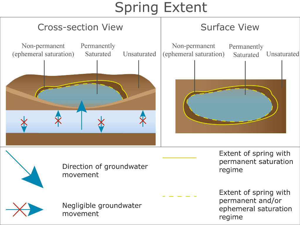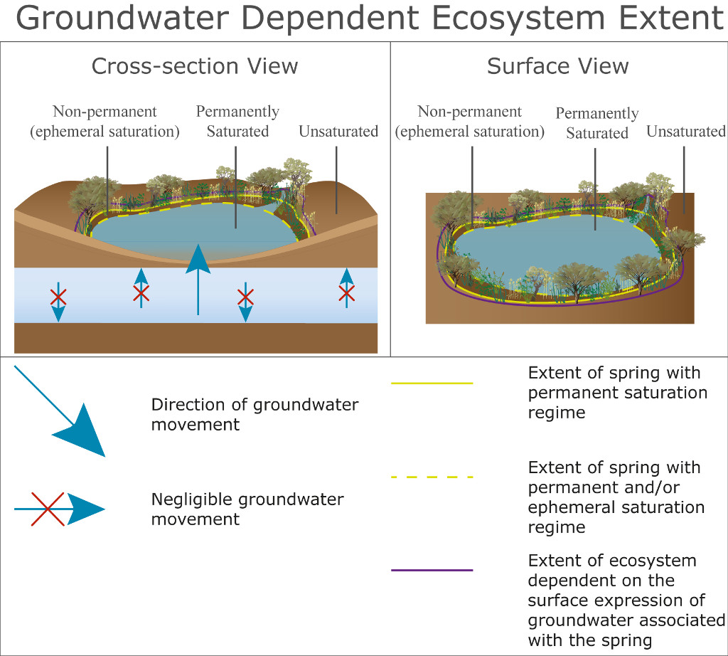 Click here for more information on springs What is the difference between a spring and a groundwater dependent ecosystem (GDE)?An ecosystem on the land surface may be dependent on this surface expression of groundwater (whether the expression is permanent or non-permanent, diffuse or point source, or dynamic or static in spatial location) and this ecosystem would be groundwater dependent ecosystem. Are all groundwater dependent ecosystems (GDEs) associated with a spring?Not all groundwater dependent ecosystems are associated with a spring. Ecosystems dependent on the sub-surface presence of groundwater (e.g. a terrestrial ecosystem) will not be associated with a spring as the groundwater will not express at the surface. An ecosystem dependent on the surface expression of groundwater will always be associated with a spring, for example, palustrine wetland (e.g. swamps), lacustrine wetland (e.g. lakes), riverine wetland (e.g. streams) and estuarine and near-shore marine. How far does a spring extend on the surface?The surface extent of the spring is limited to the spatial extent where groundwater discharges to the surface. Therefore a spring does not extend downslope despite the fact that the groundwater discharged by a spring might move downslope. For example, a spring at a fixed spatial location with a permanent saturation regime will be defined by the extent of the spring vent. However, a groundwater dependent wetland on the surface associated with the spring may extend much further than the spring extent. How far does a groundwater dependent ecosystem (GDE) extend from a spring?There is no standard distance a groundwater dependent ecosystem extends from a spring as they reflect local conditions. For example, a spring with diffuse discharge into a river can support surface expression riverine groundwater dependent ecosystems for several hundred meters to kilometres depending on the spring flow rate, spring extent, and local hydrogeological characteristics. In arid environments, a spring with a permanent saturation regime and a fixed spatial location may only support a surface expression palustrine groundwater dependent ecosystem extending less than one hectare from the spring vent. What is the relationship between the Queensland Springs Dataset, the Queensland Wetlands Data, and the Queensland Groundwater Dependent Ecosystems Data Sets?The Queensland Springs DatasetThe Queensland Springs Dataset provides point locations of springs, hydrogeological features by which groundwater discharges natural to the land or cave surface. This dataset includes springs with permanent and non-permanent (i.e. intermittent or ephemeral) saturation regimes, dynamic or static geographic locations, and diffuse or point source geographic locations. The Queensland Springs Dataset is the point of truth for spring information in Queensland. The dataset is presented as two layers: