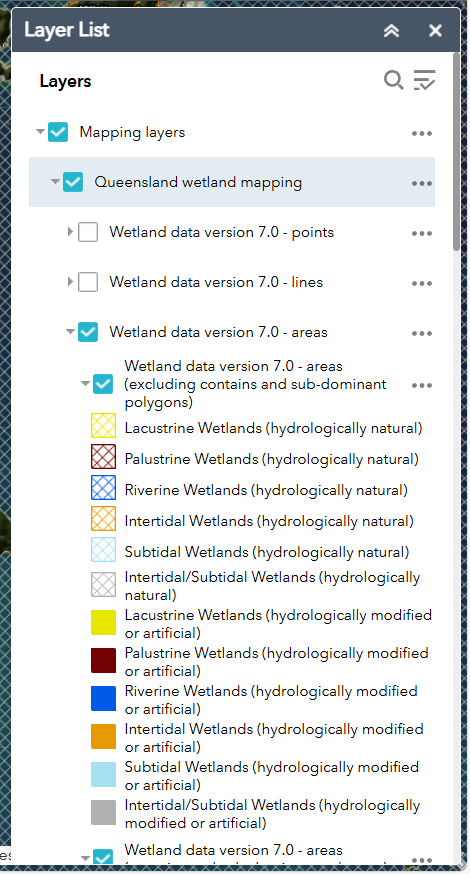 The data developed via the Wetlands Insight Tool presents a combined view of Water Observations from Space, Tasseled Cap Wetness and Fractional Cover measurements from the Landsat series of satellites for each palustrine and lacustrine wetland in the Queensland wetland mapping*. The data is summarised as a series of hydrological attributes and visualised as stacked line plots. Please noteThe DEA Wetlands Insight Tool is based on remotely sensed satellite imagery and requires field validation so care should be used when interpreting results as increases/decreases in cover types can (1) conflate technical limitations with on-ground change, and/or (2) be associated with different processes. For example an increase in green cover could indicate canopy recovery of desirable wetland species or an increase in the presence of invasive weeds. Data quality may vary. The stack line plot will display periods of low data quality (defined as less than 4 observations in a 6 month period) as pale overlays. An attribute on data quality has also been provided in the mapping data to indicate data quality. The period between when Landsat 5 ceased operations (November 2011) and Landsat 8 data became routinely available (May 2013) has been identified in the stacked line plot as a low data quality period. The 30-metre resolution of Landsat imposes an intrinsic limitation on the Wetlands Insight Tool. Wetland areas that are small, or long and narrow in nature are likely to be inaccurate (due to inclusion of neighbouring non-wetland pixels) or difficult to interpret (stack line plots for areas with a small number of pixels have sharp steps in them). For more information - see Wetlands Insight Tool: Characterising the Surface Water and Vegetation Cover Dynamics of Individual Wetlands Using Multidecadal Landsat Satellite Data. How to use - WetlandMapsTo access hydrological attributes and the stacked line plot