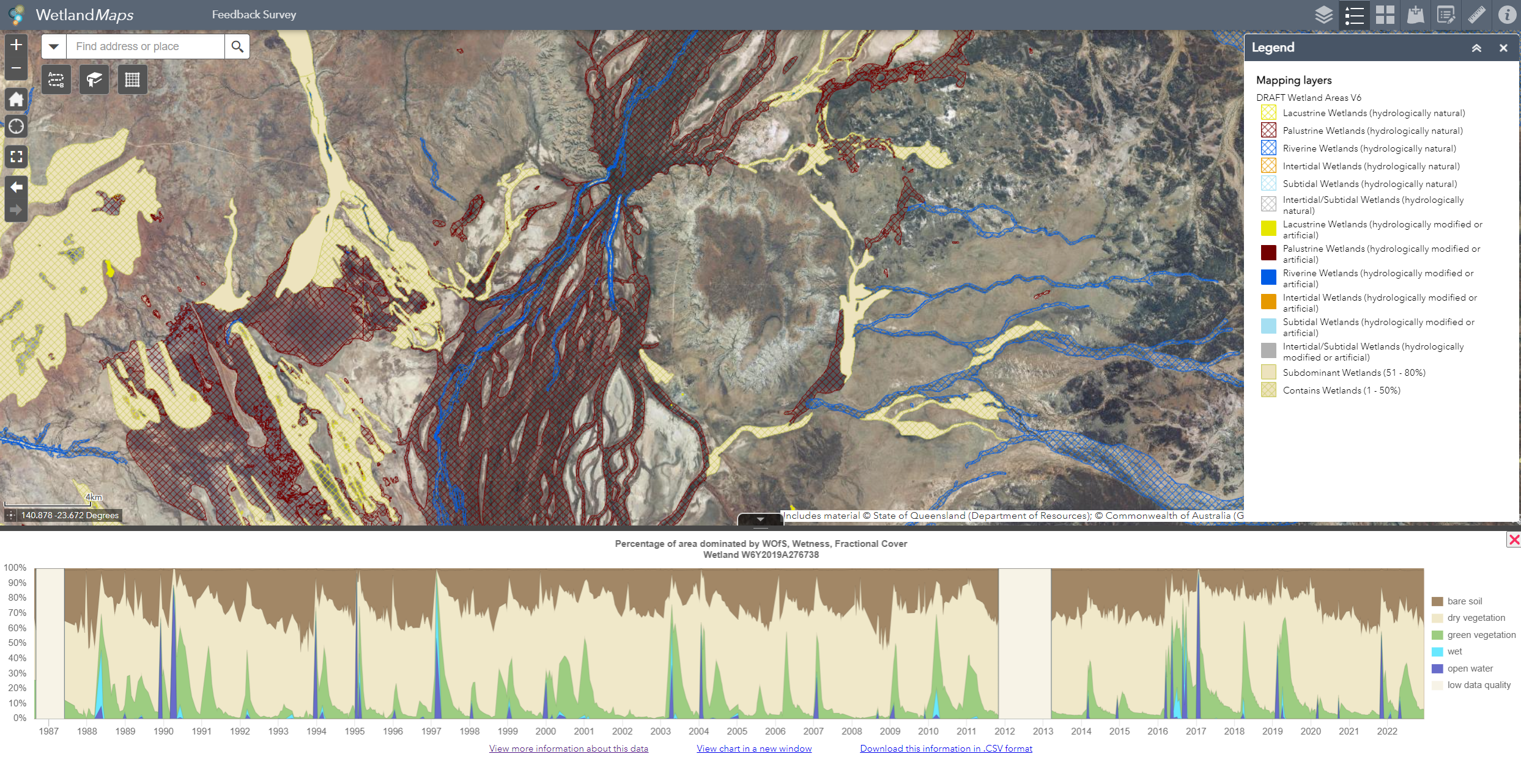 Digital Earth Australia (DEA) Wetlands Insight Tool (QLD)The Queensland Government has worked with the Australian Government (Geoscience Australia) to develop the DEA Wetlands Insight Tool (QLD)[1]. The Wetlands Insight data display on WetlandMaps summarises how the amount of open water, wet, green vegetation, dry vegetation and bare soil varies over time within each wetland. This information provides wetland managers and scientists with a historical baseline of wetland dynamics based on Landsat data starting from 1987. Quick facts