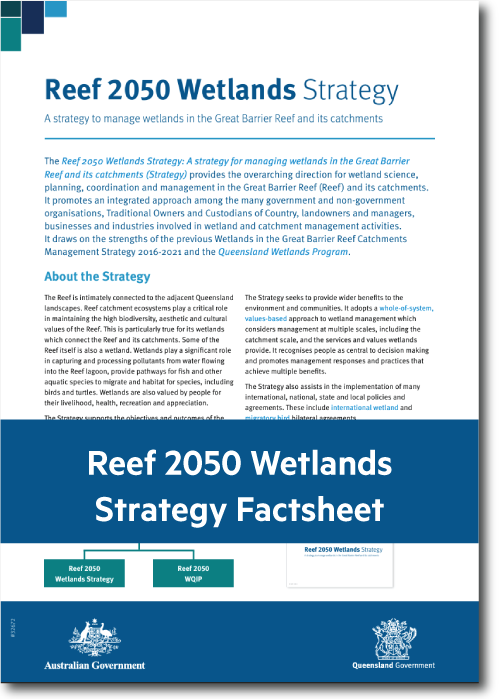 Reef 2050 Wetlands StrategyThe Reef 2050 Wetlands Strategy: a Strategy to manage wetlands in the Great Barrier Reef and its catchments (Reef 2050 Wetlands Strategy) is a joint commitment between the Australian Government and the Queensland Government, and provides direction for wetland science, planning, coordination and management in the Great Barrier Reef and its catchments. The Reef 2050 Wetlands Strategy sits under the Reef 2050 Long–Term Sustainability Plan (Reef 2050 Plan) which provides the overarching direction to improve the health of the Great Barrier Reef. The Reef 2050 Wetlands Strategy factsheet has also been published.