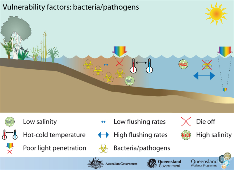 Department of the Environment, Tourism, Science and Innovation, Queensland (2013) Bacteria/pathogens – Vulnerability, WetlandInfo website, accessed 15 December 2025. Available at: https://wetlandinfo.detsi.qld.gov.au/wetlands/management/pressures/lacustrine-palustrine-threats/bacteria-pathogens/vulnerability.html
